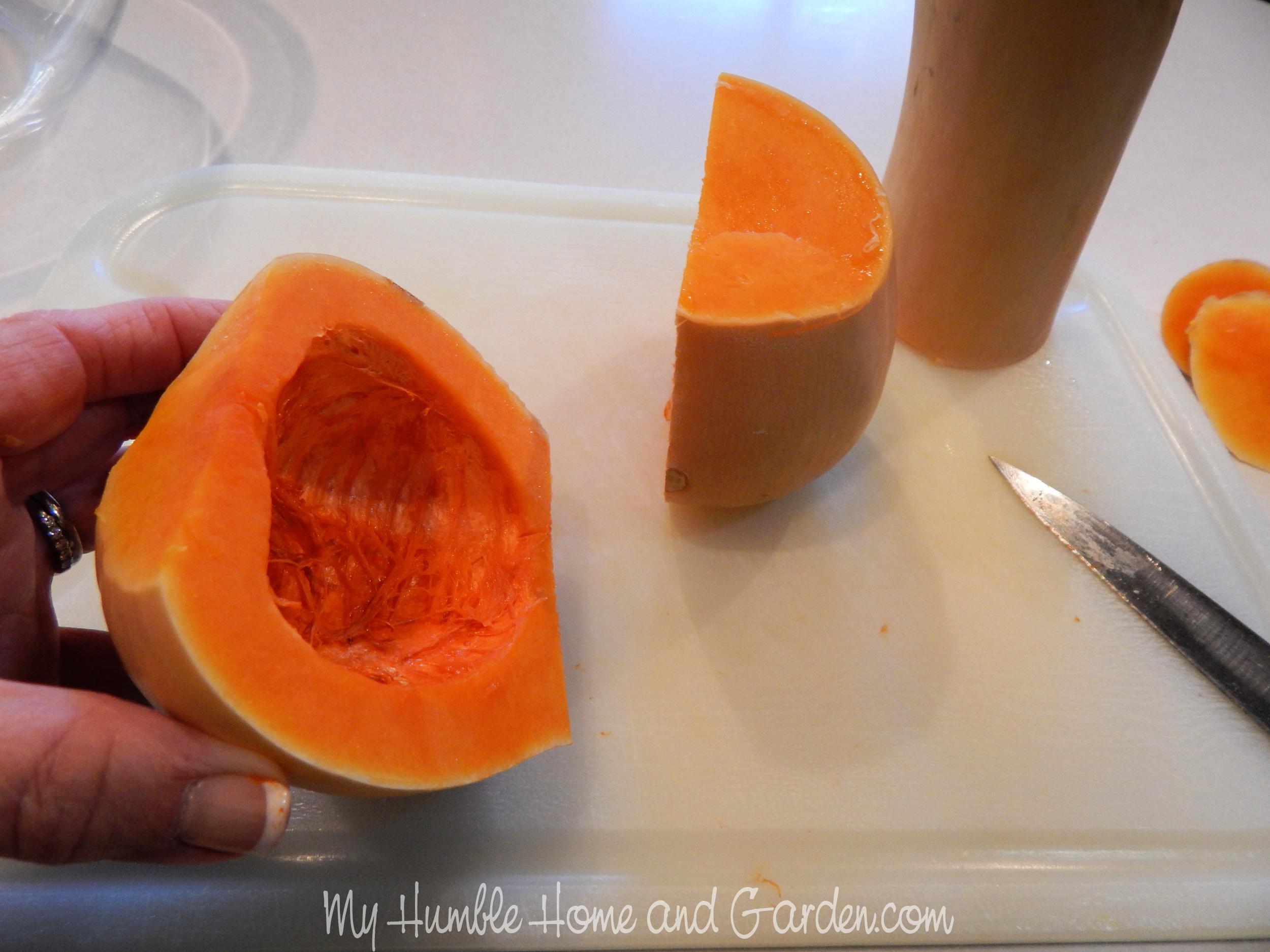 Garlic Shrimp and Butternut Squash Party Appetizers They’ll Love -Scrape out the pulp and seeds. #appetizers #butternutsquash #shrimp