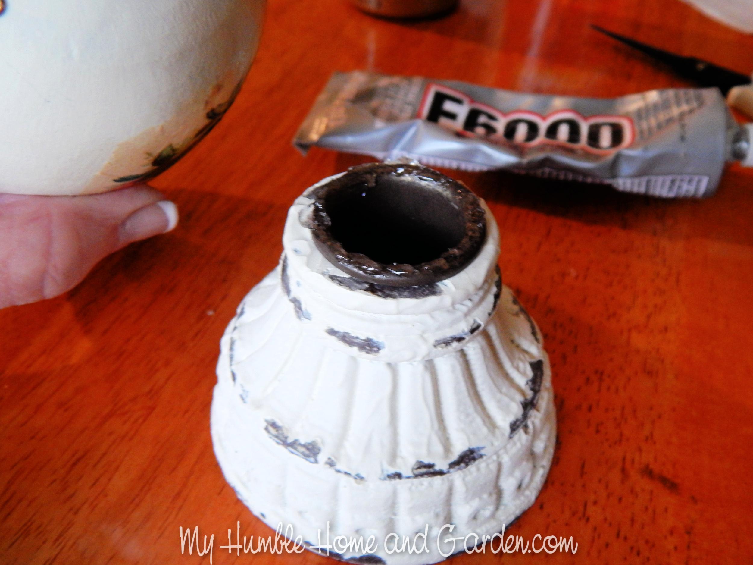 How to Make a Vintage Easter Egg Look-Alike – Apply E6000 to the top edge of the candlestick holder. #vintageeasteregg #easteregg #easterdecor