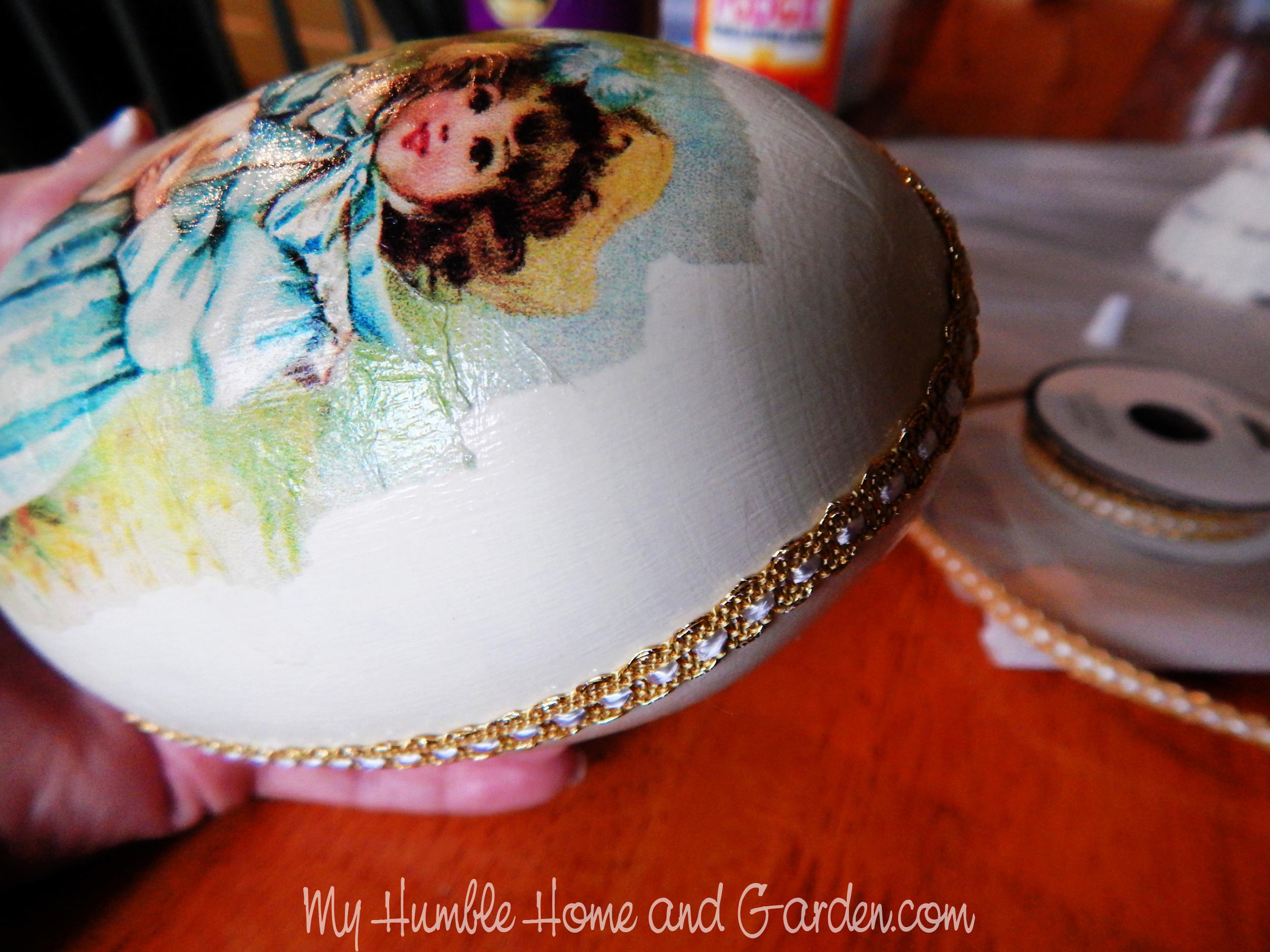 How to Make a Vintage Easter Egg Look-Alike – Glue the decorative trim around the egg. #vintageeasteregg #easteregg #easterdecor