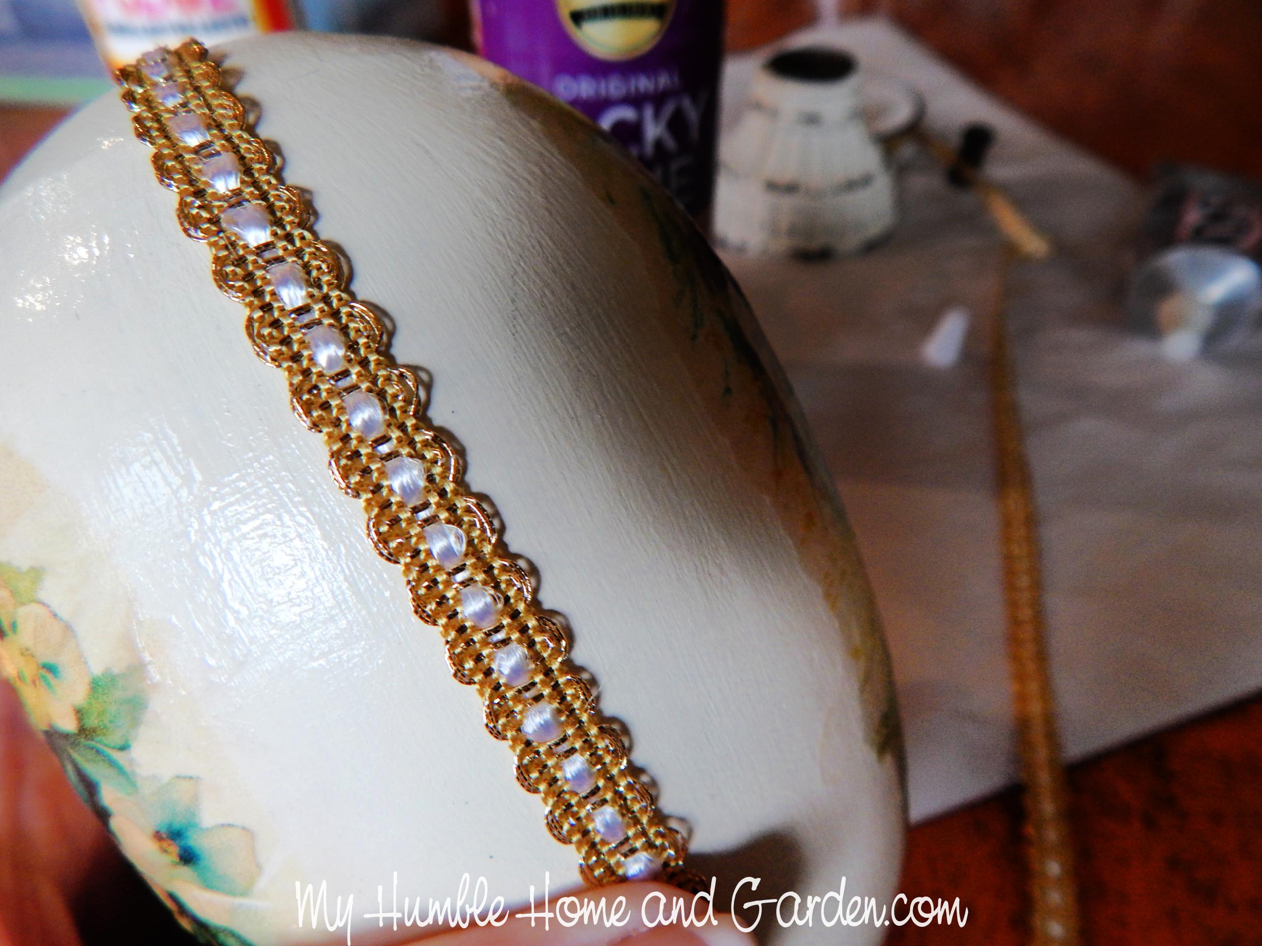 Glue the decorative trim to the egg. Posted on 2024-02-232024-02-23Full size 2500 × 1875 Glue the decorative trim to the egg. How to Make a Vintage Easter Egg Look-Alike – Glue the decorative trim to the egg. #vintageeasteregg #easteregg #easterdecor