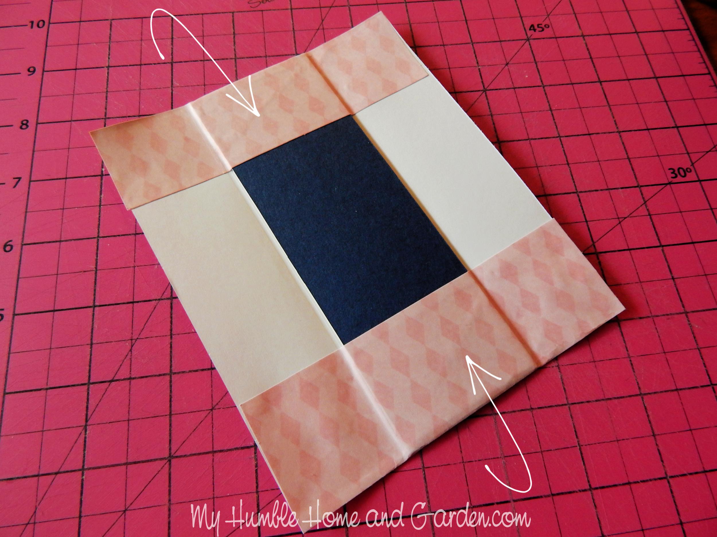 Measure the length of two sides and add 1/2 inch to the measurement. Cut a sheet of 12″ x 12″ decorative paper this length. In this case, 5″ + 5″ + 1/2″ = 10 – 1/2″.