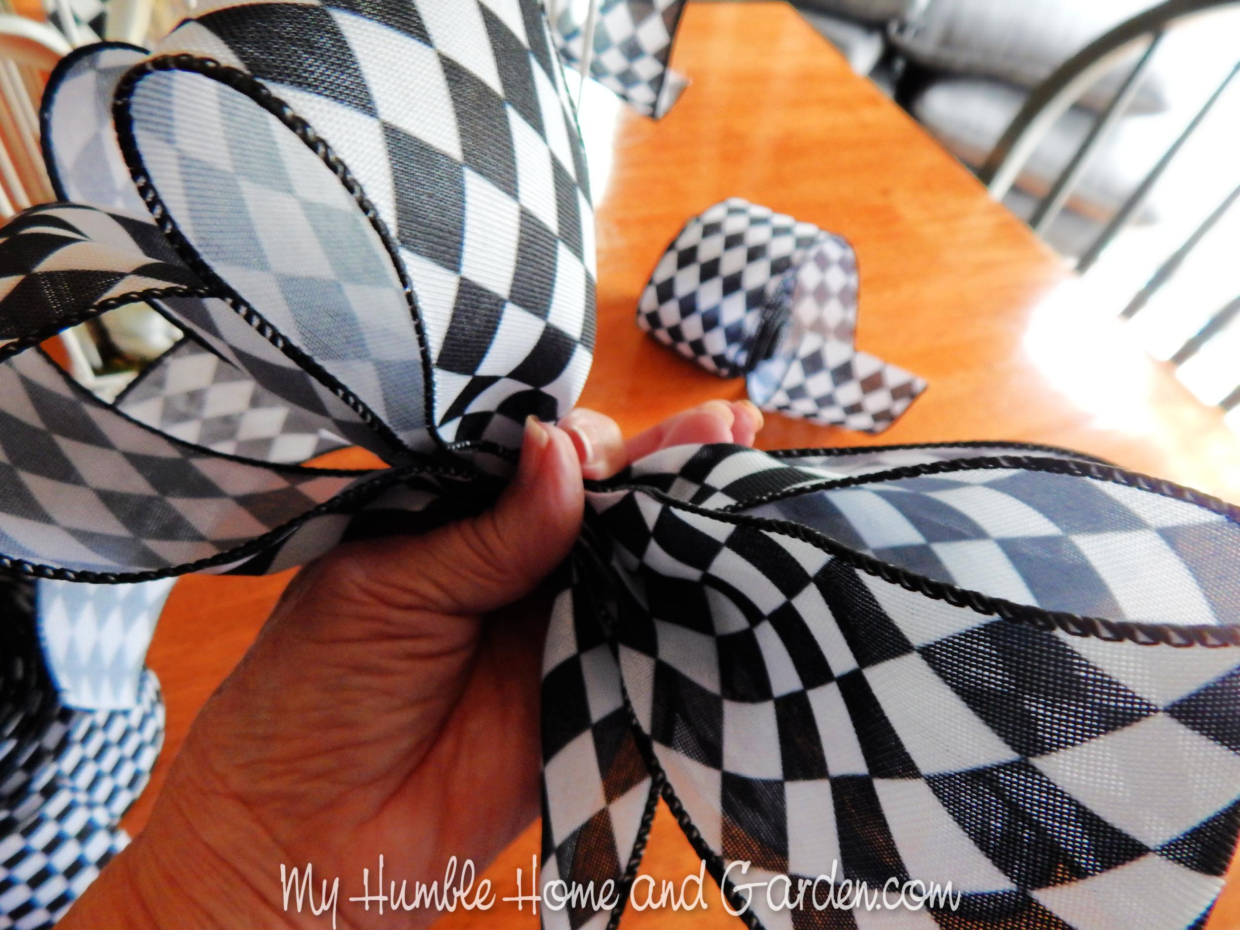 How to Make an Alice in Wonderland Centerpiece – Make 6 larger loops with the herringbone plaid ribbon. #aliceinwonderlandcenterpiece #centerpiece