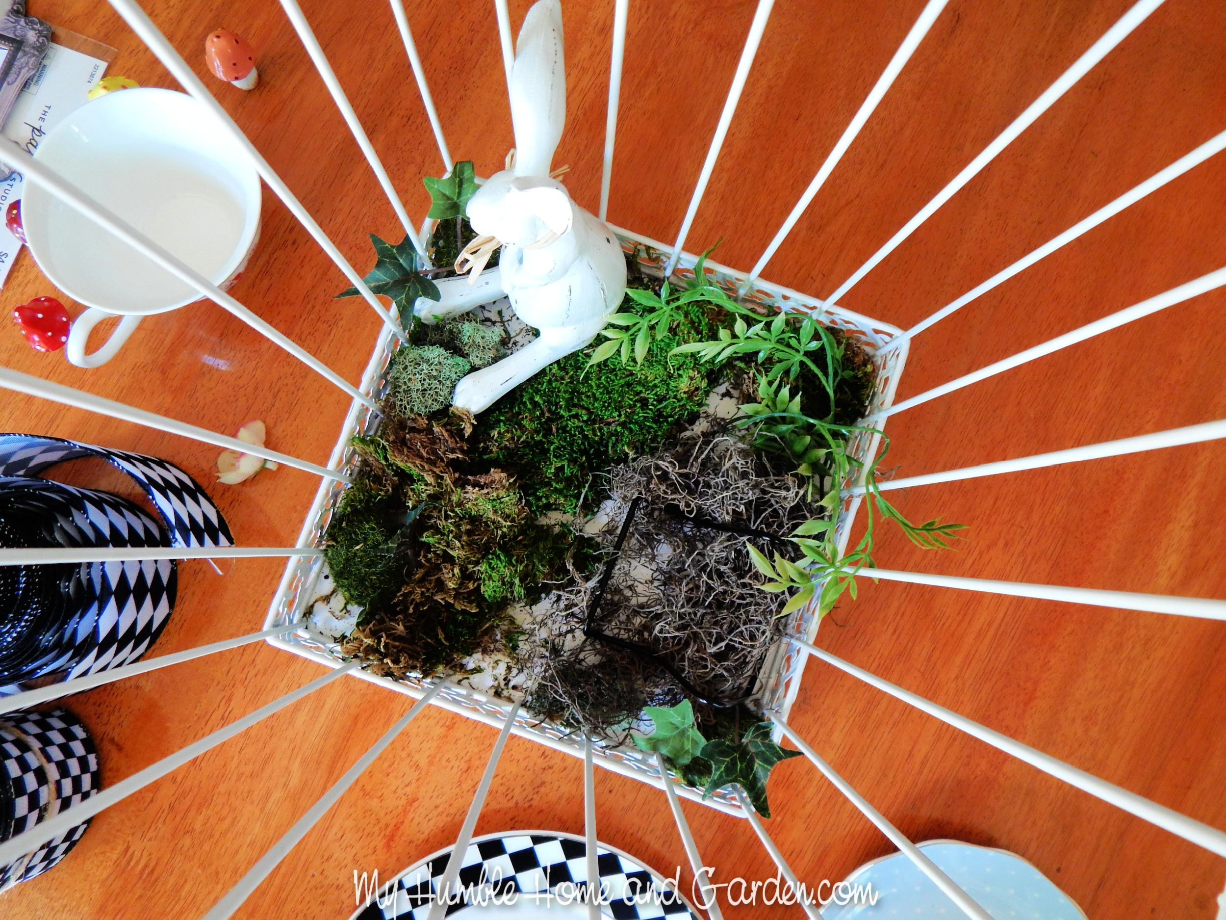 How to Make an Alice in Wonderland Centerpiece – Set the bunny on top of the mosses and greenery. #whiterabbit #AliceinWonderland