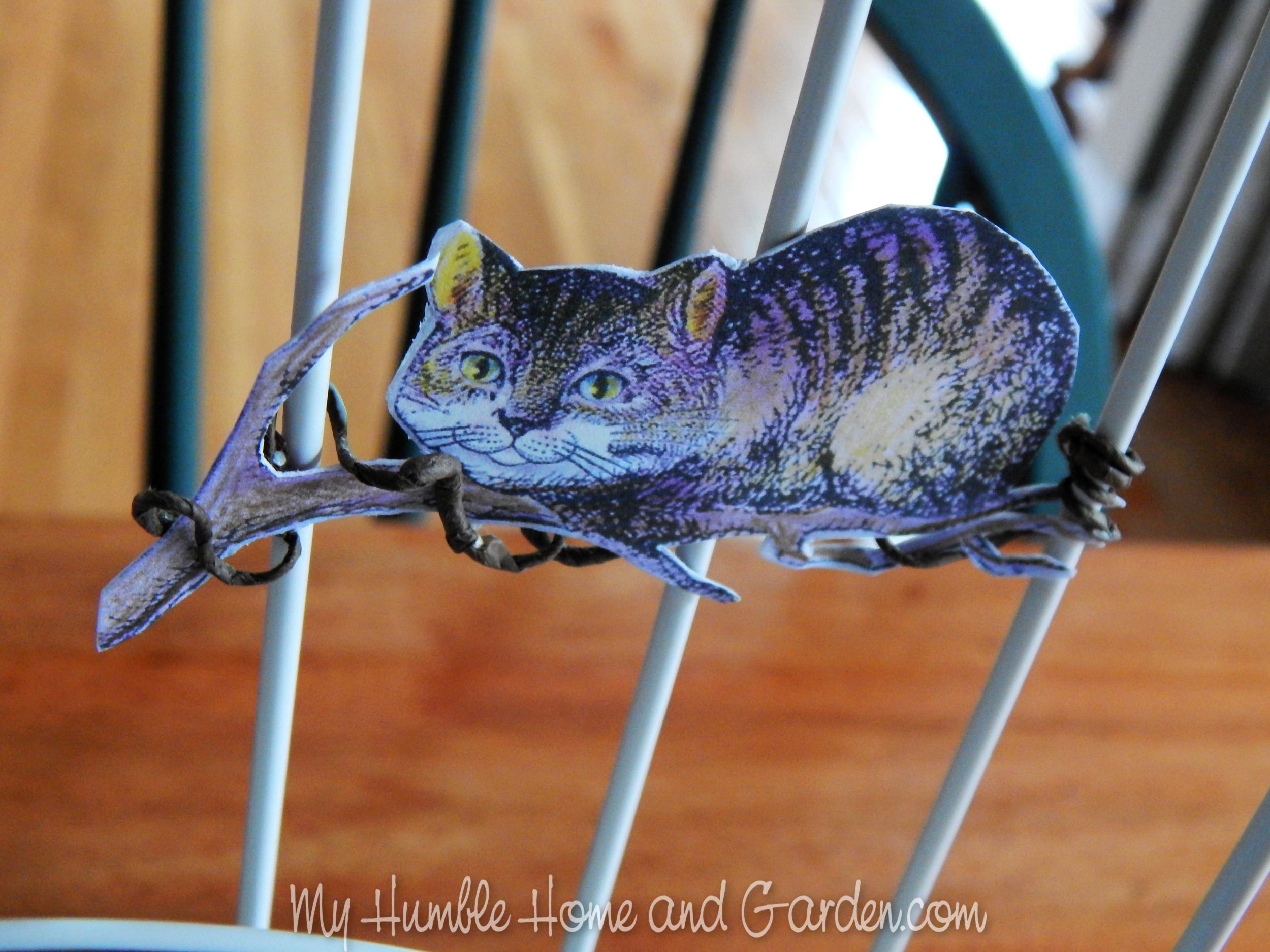 How to Make an Alice in Wonderland Centerpiece -Use brown paper wrapped wire to attach the Cheshire Cat. #cheshirecat #Aliceinwonderland