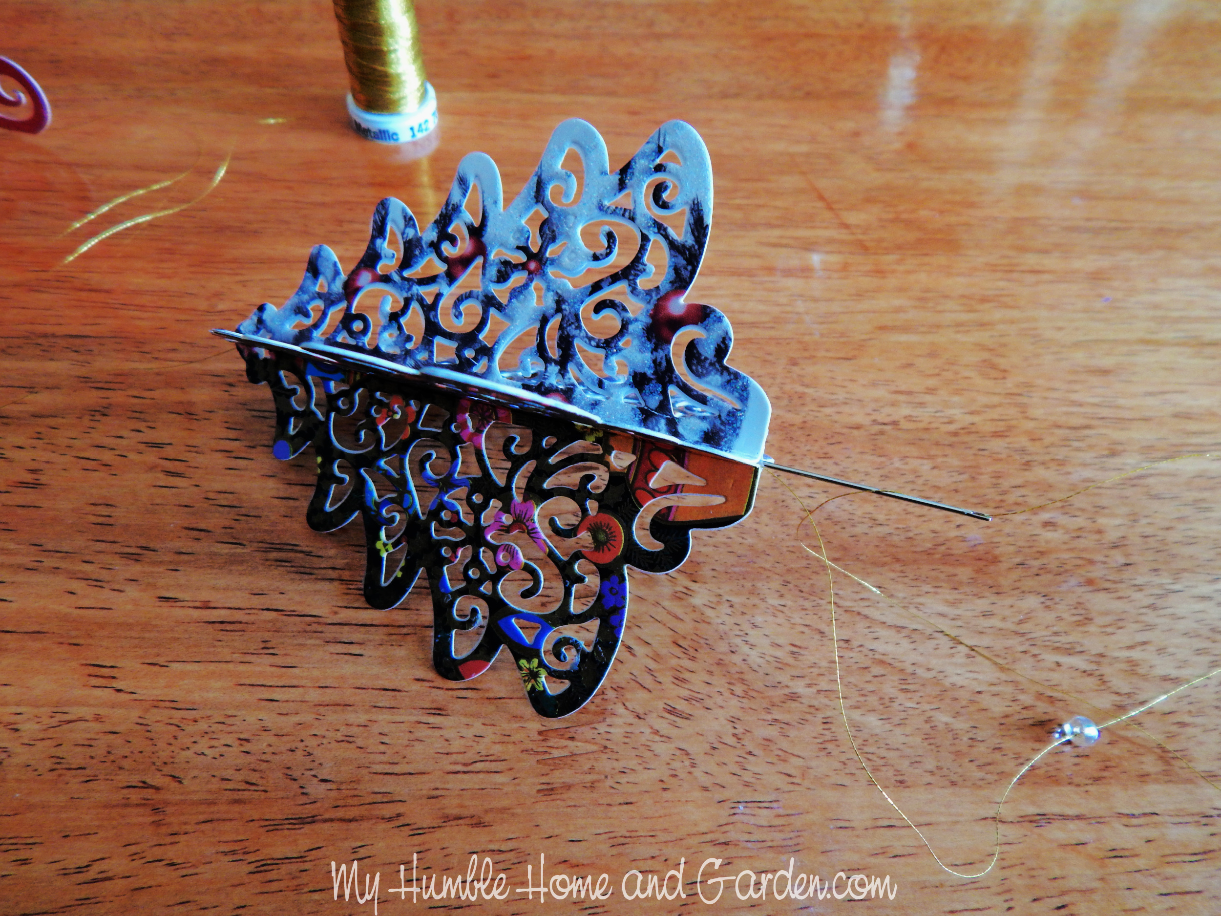 Beautiful Christmas Tree Crystal Ball – Upcycle Old Christmas Cards -Run the thread thru the bead and back through the tree. Christmasdecor #Christmas #Christmasglobe