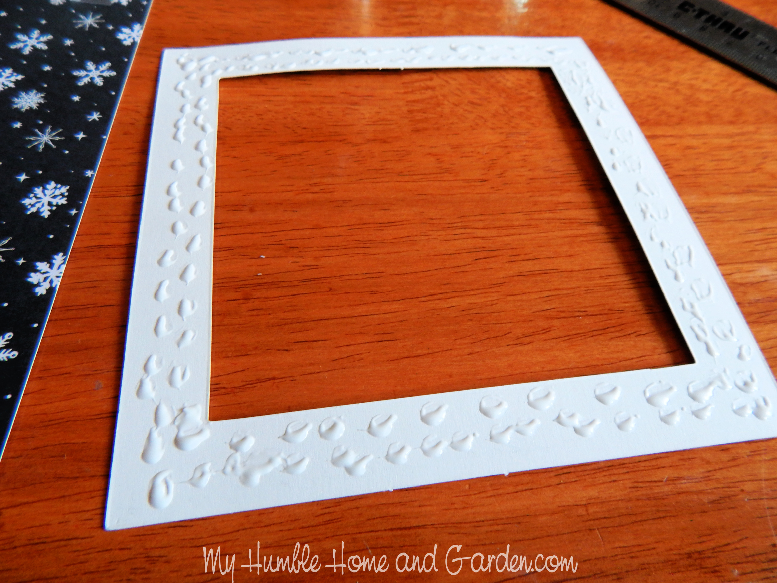 How to Use Tin Foil for Beautiful Christmas Cards – Dab glue on the back of the cardstock frame. – #Christmascards #DIYChristmascards #Christmascrafts