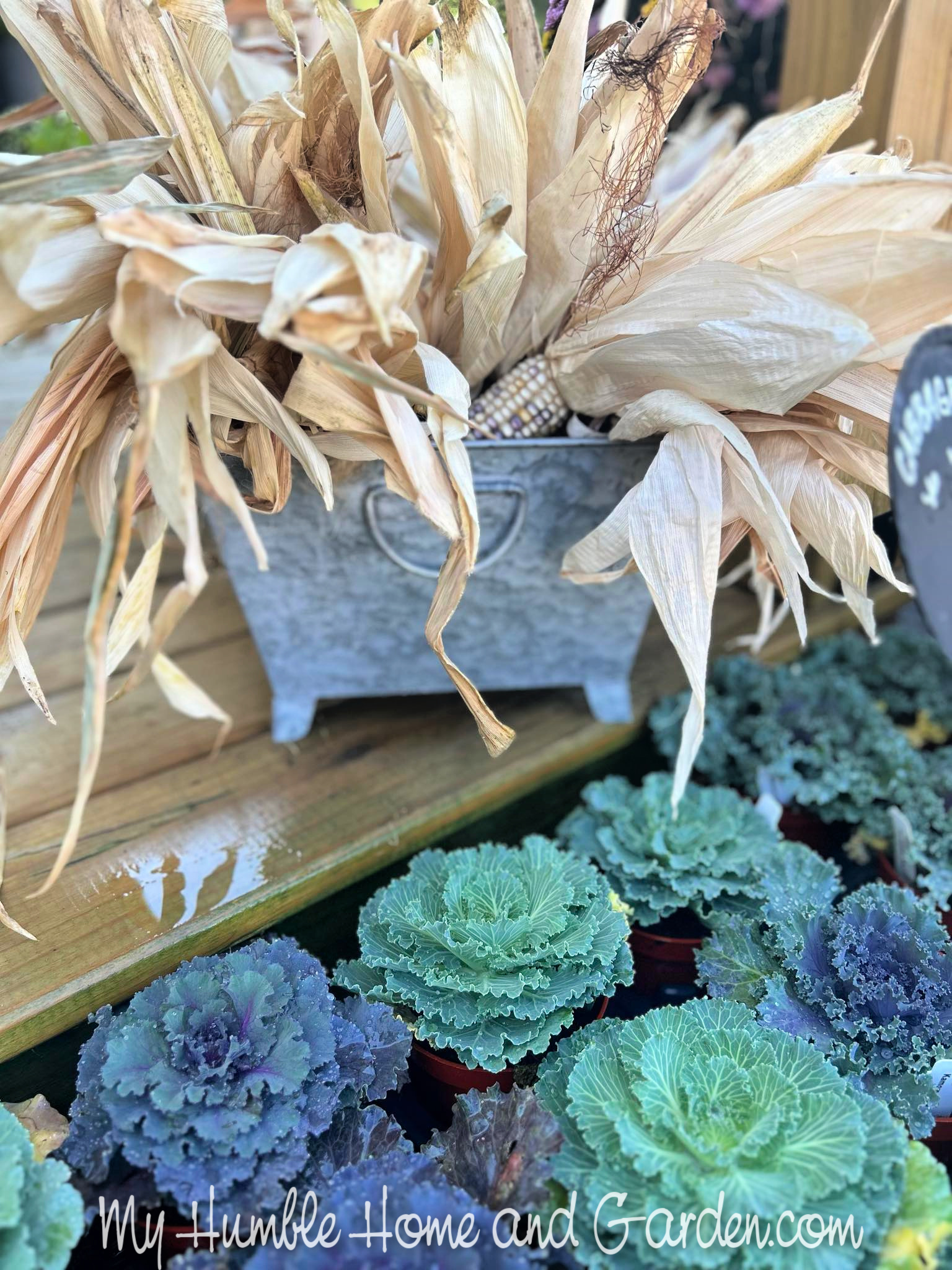 How to Update Your Front Porch Planters for Fall – Indian corn, kale, and cabbages at Morris Garden Center. #morrisgardencenter