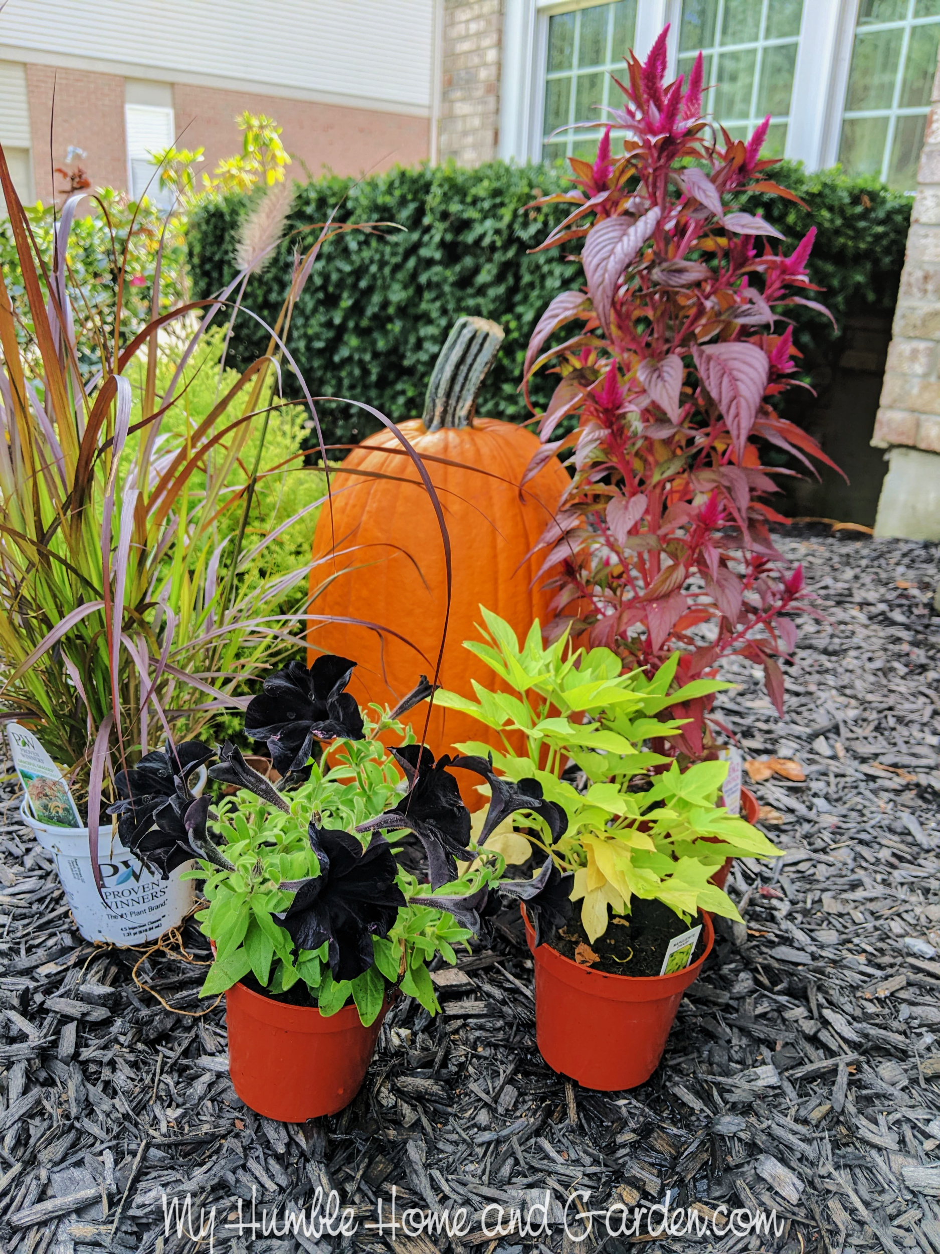 How to Update Your Front Porch Planters for Fall – Purlple fountain grass, black petunias, Sweet potato vine, celosia, and pumpkin gourd. #sweetpotatovine #celosia #pumpkingourd