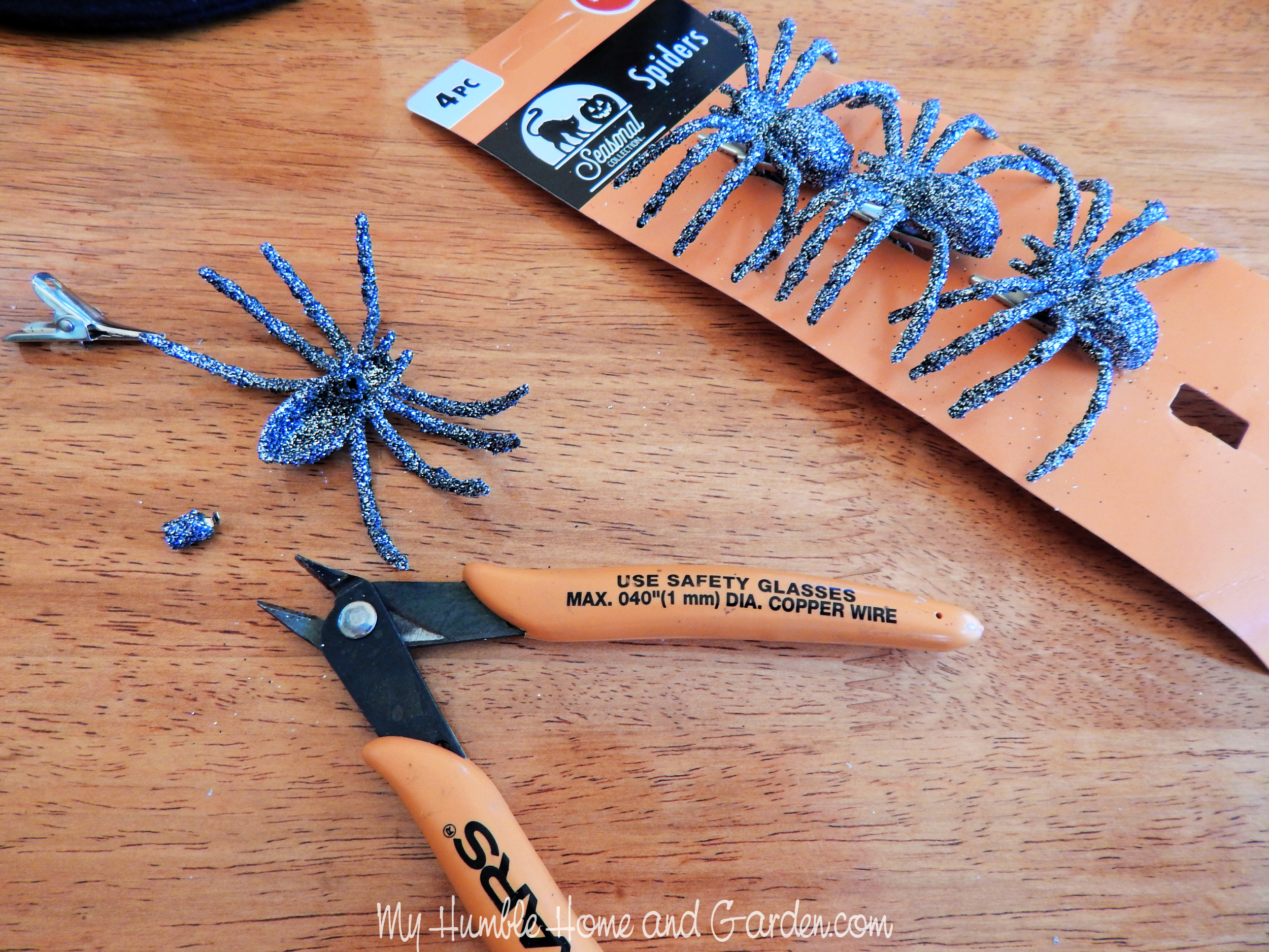 How to Make a Bedazzled Skeleton Top Hat Remove the clip and cut off the plastic holder. #skeletontophat #bedazzled #tophat #dollartreespider