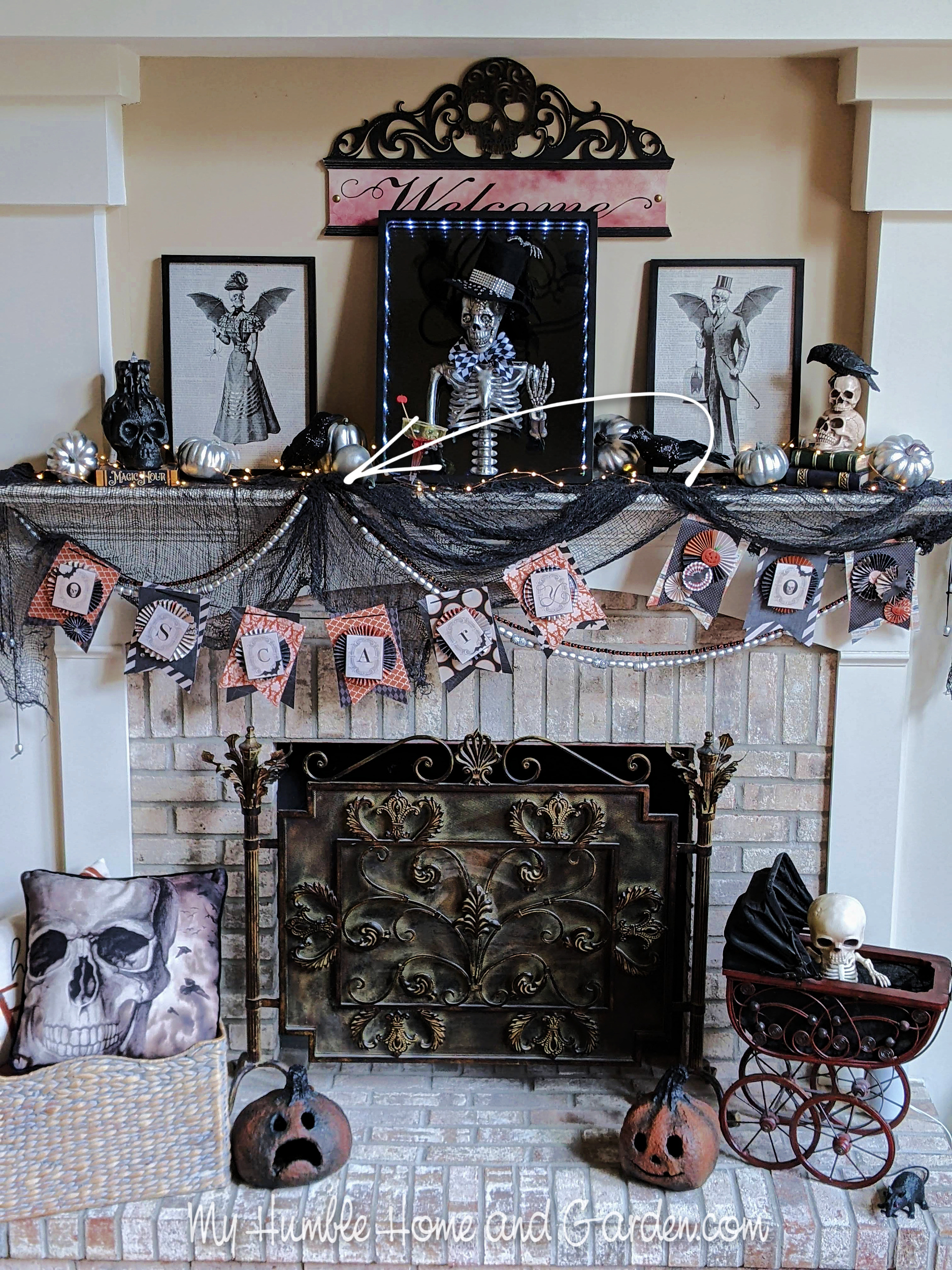 How to Design a Very Spooky Skeleton Mantel Display – Change the drape of the garlands. #halloweenmantel #halloweendecor #skeletondecor