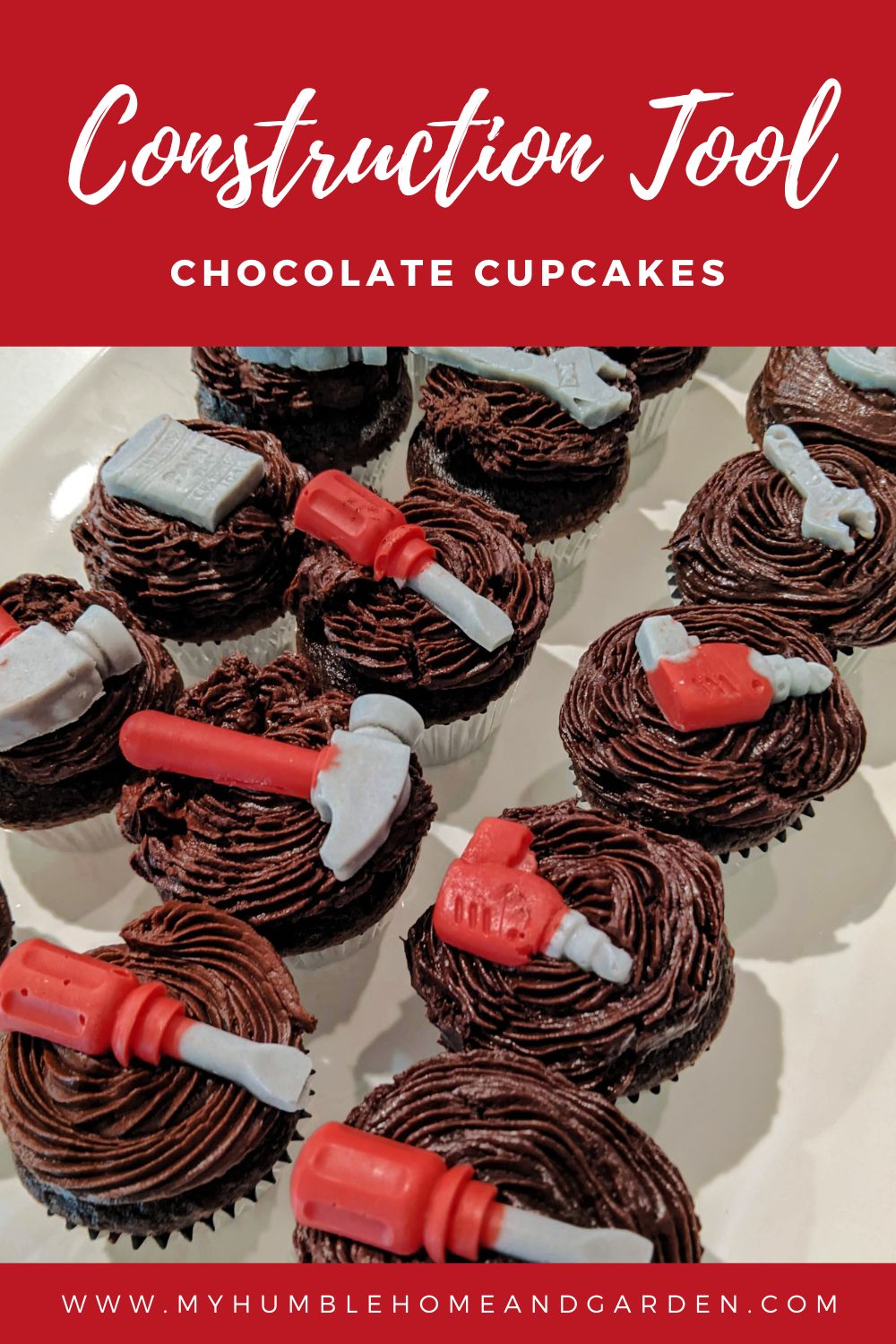 Construction Themed Chocolate Cupcakes the Kids Will Love – Mini cupcakes with Mini construction tools #miniconstructiontools #constructioncupcakes