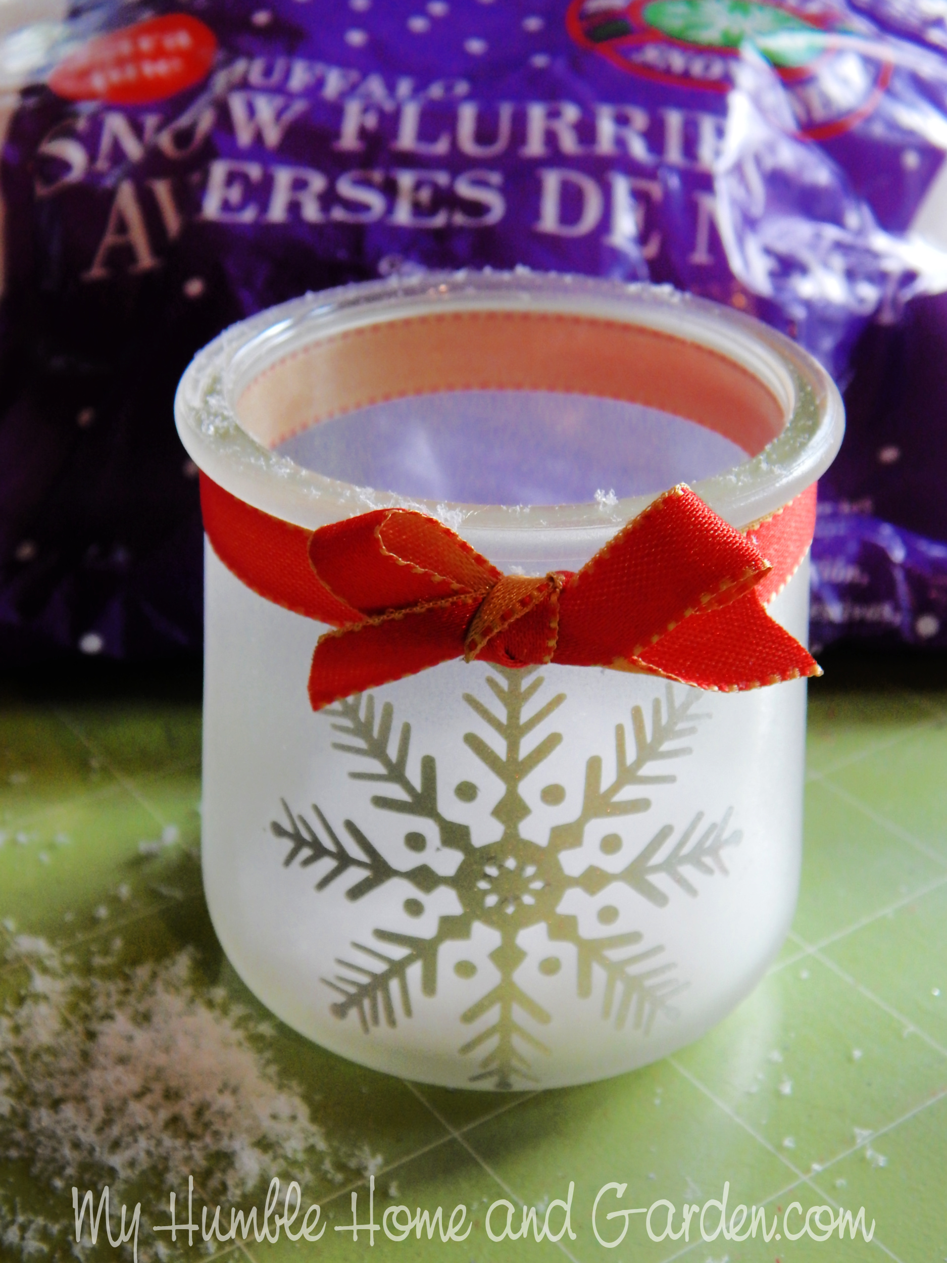 How to Make Christmas Votives from French Glass Yogurt Jar – Add faux snow. #glassyogurtjarvotives #votives #Frenchglassyogurtjars