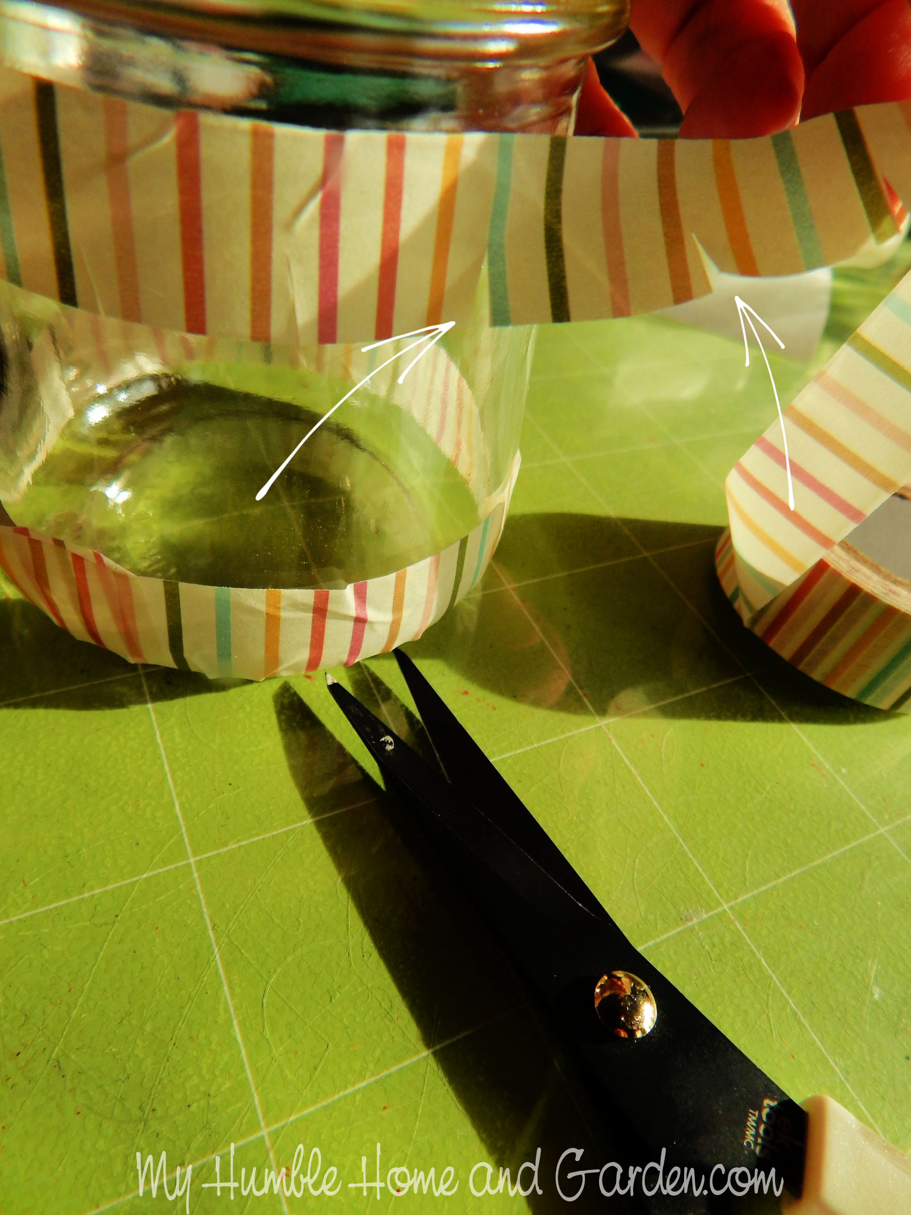 Make slices into the bottom edge of the tape. How to Make Christmas Votives from French Glass Yogurt Jars #frenchglassyogurtjars #yogurtjars #yogurtjarsvotives