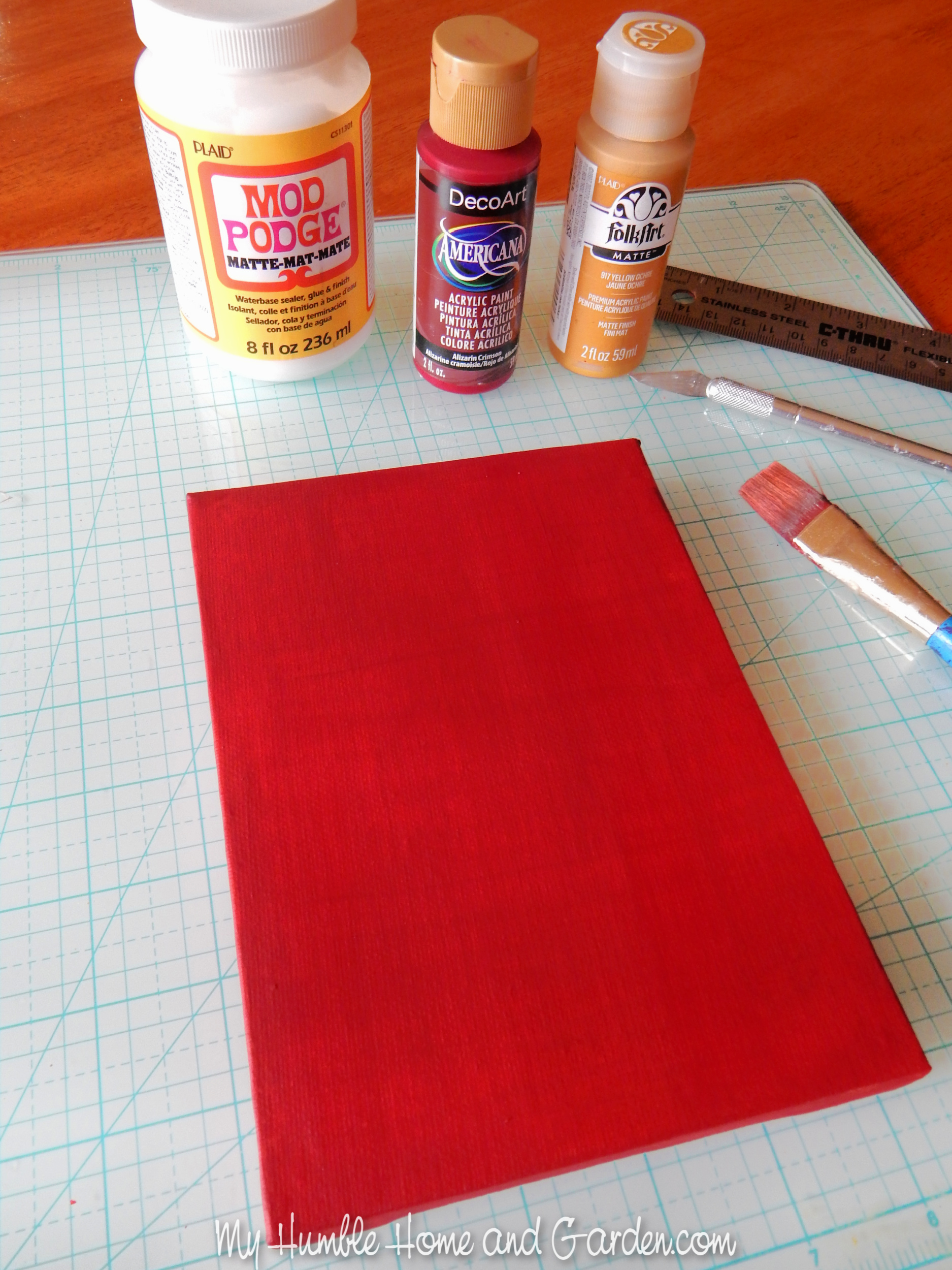 How to Make a Busted Canvas – Exploding Canvas – Paint a base coat of yellow ochre and 2 coats of Alizarin Crimson. #bustedcanvas #explodingcanvas