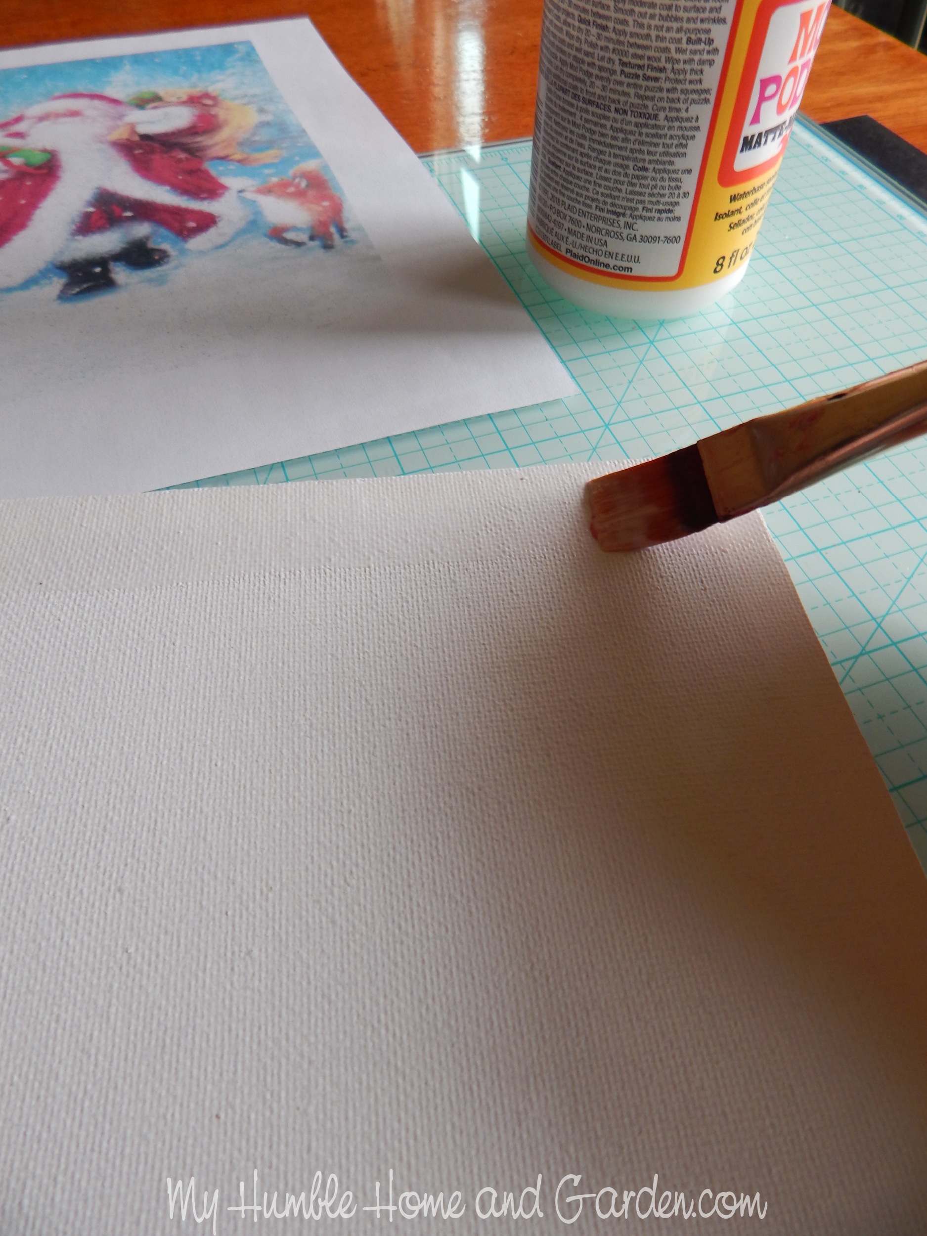 How to Make a Christmas Busted Canvas Easily – Paint a strip of Mod Podge across the top of the canvas. #bustedcanvas #explosioncanvas