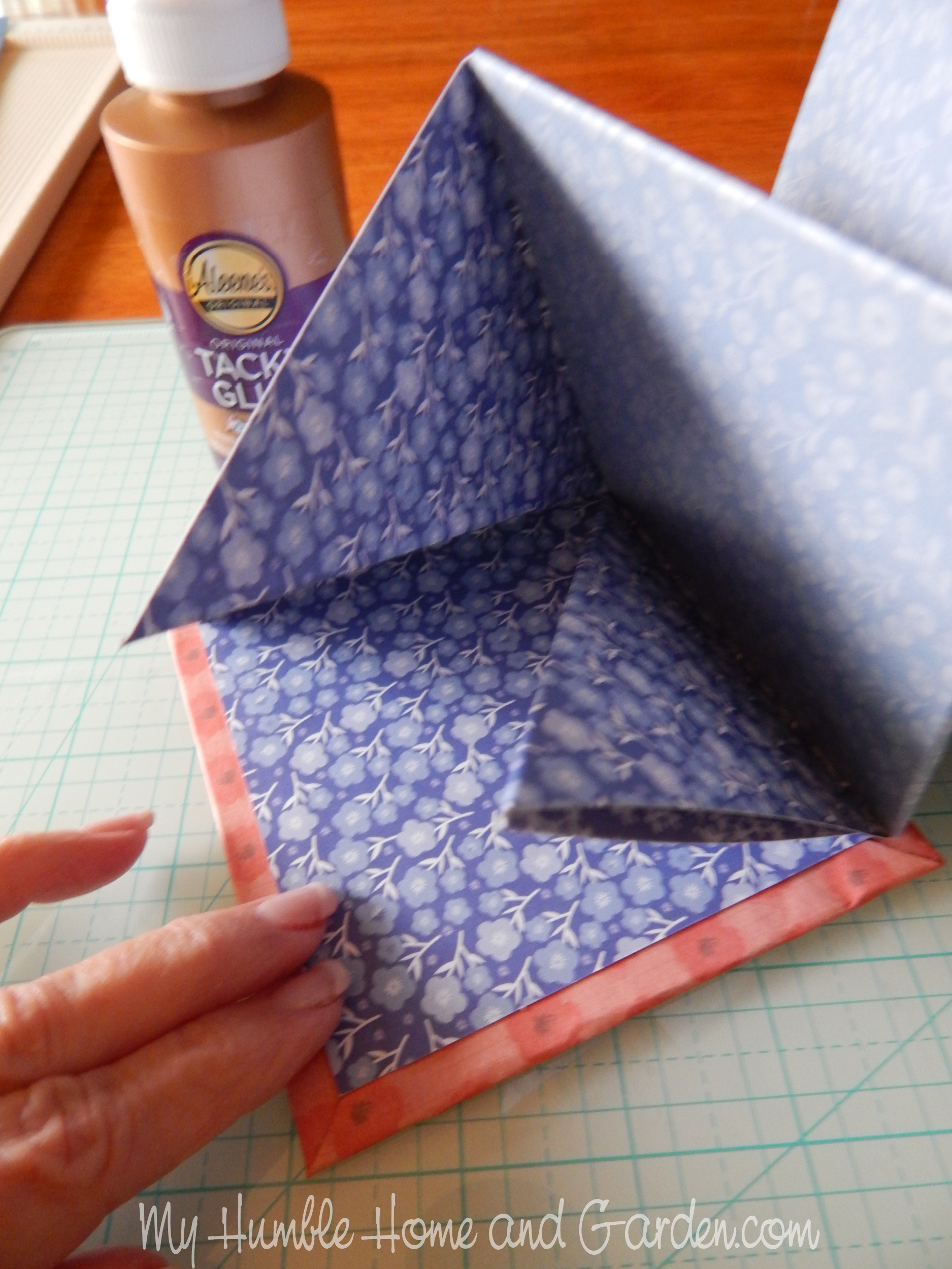 How to Make an Explosion Book – Squash Book – Apply glue to the back of the cardstock corner square and center on the cardstock square.
