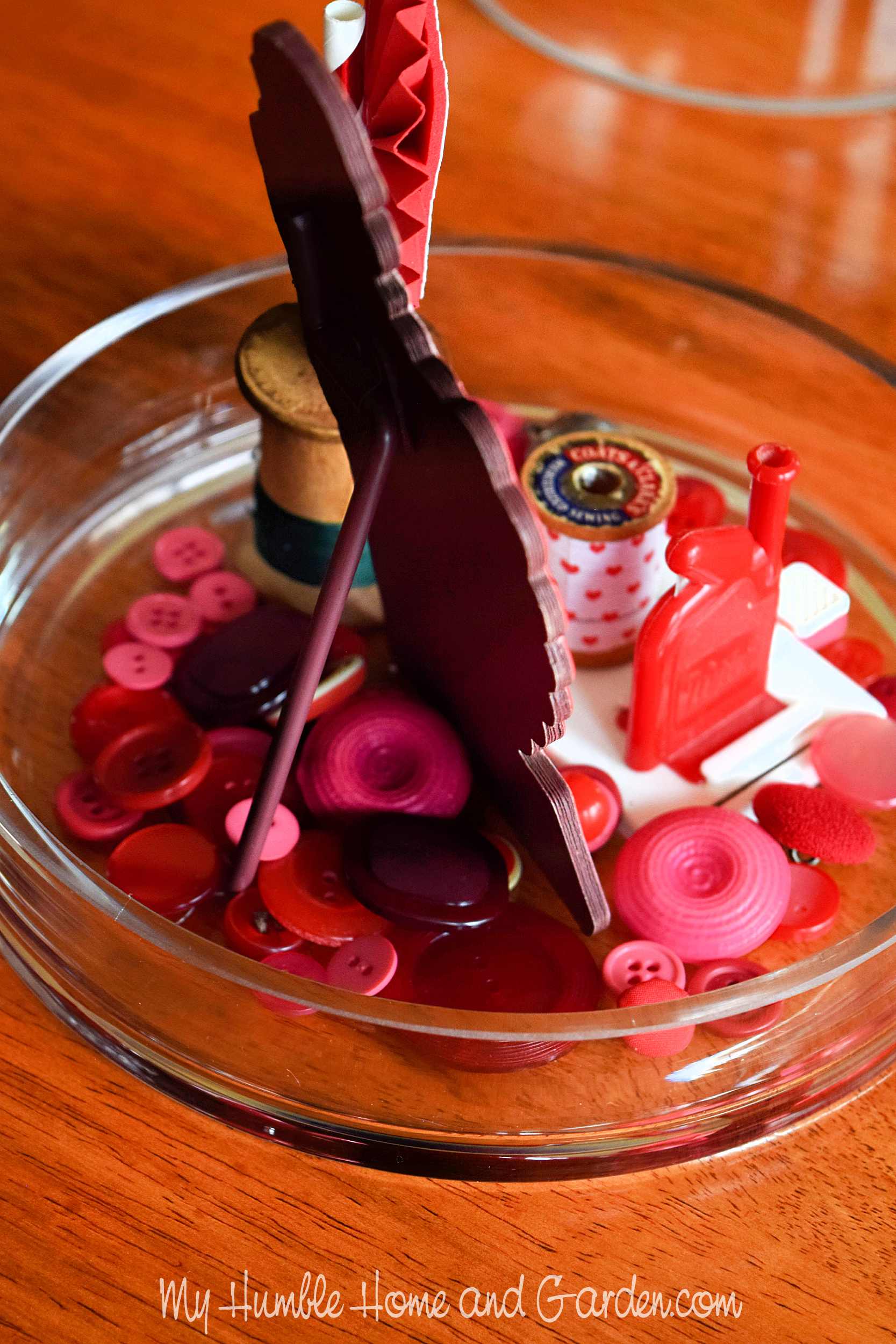 Place the red and pink buttons around the Valentine, needle threader, and spool base. Then, place the cloche dome on the base.