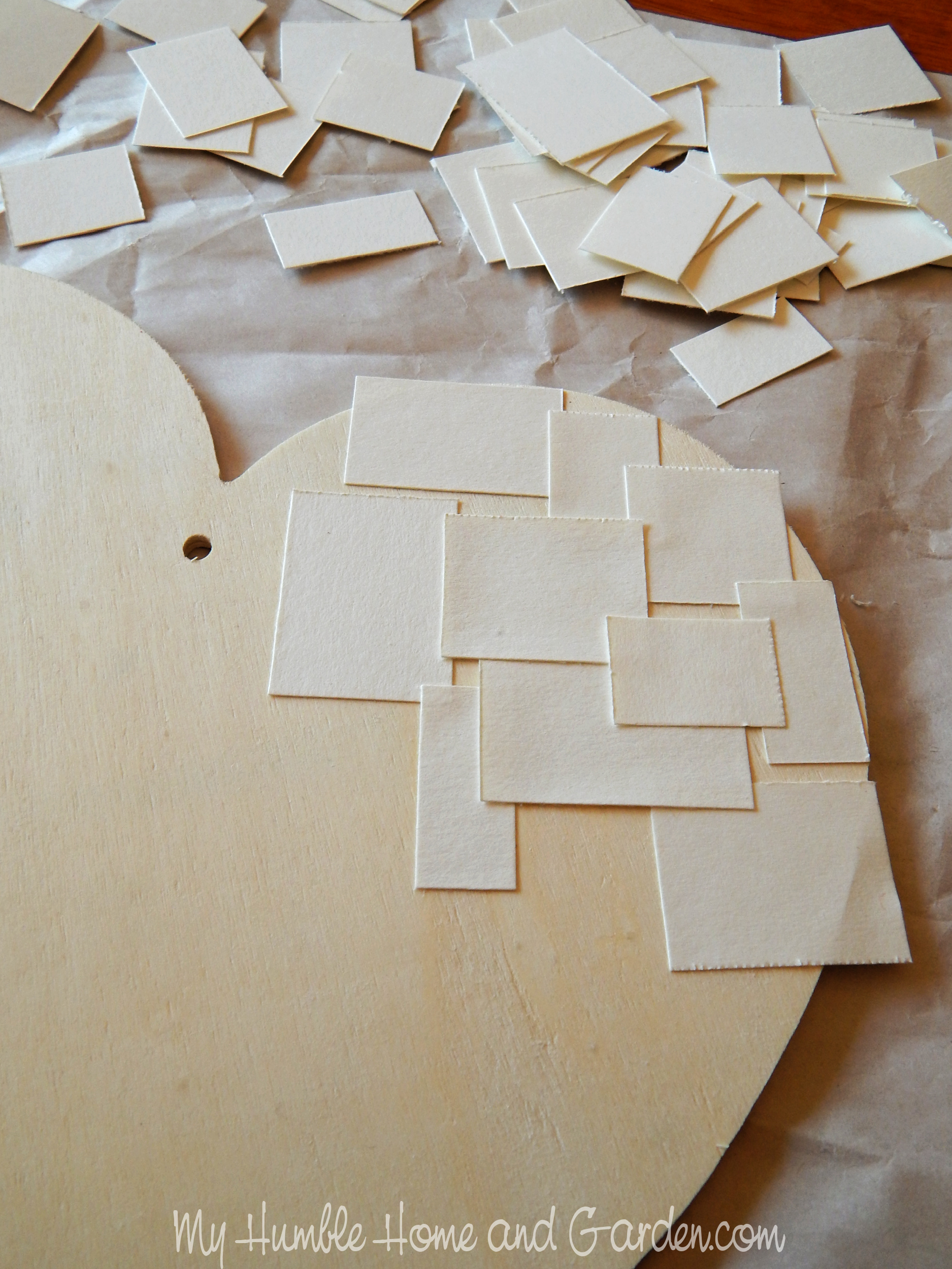 Begin gluing the squares and rectangles to the wooden heart. Wooden Hearts Craft Ideas You’ll Want to Make Now! #woodenheartscrafts #woodenhearts