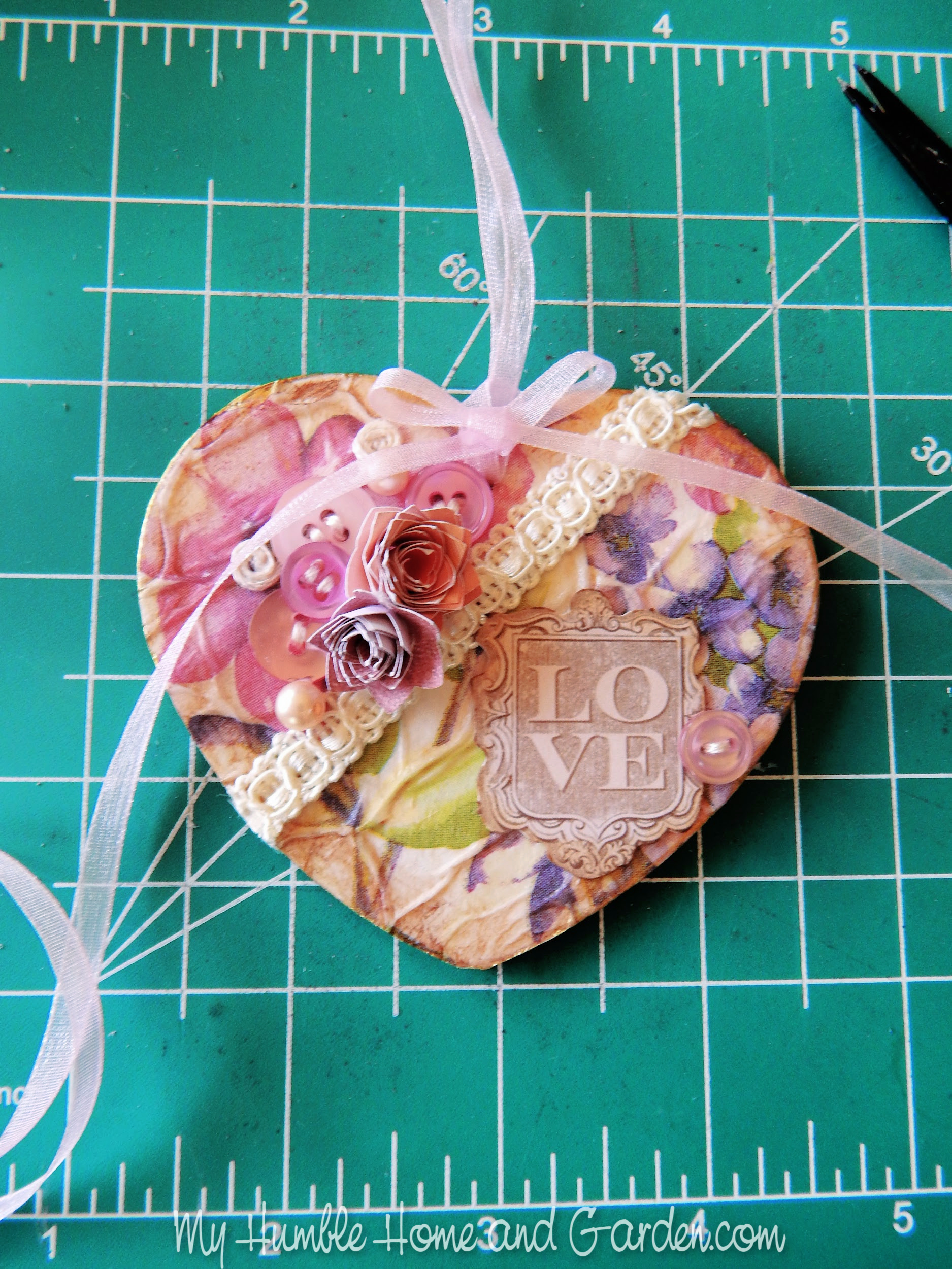 Thread ribbon through the hole and glue a ribbon bow to the base of the looped ribbon.
