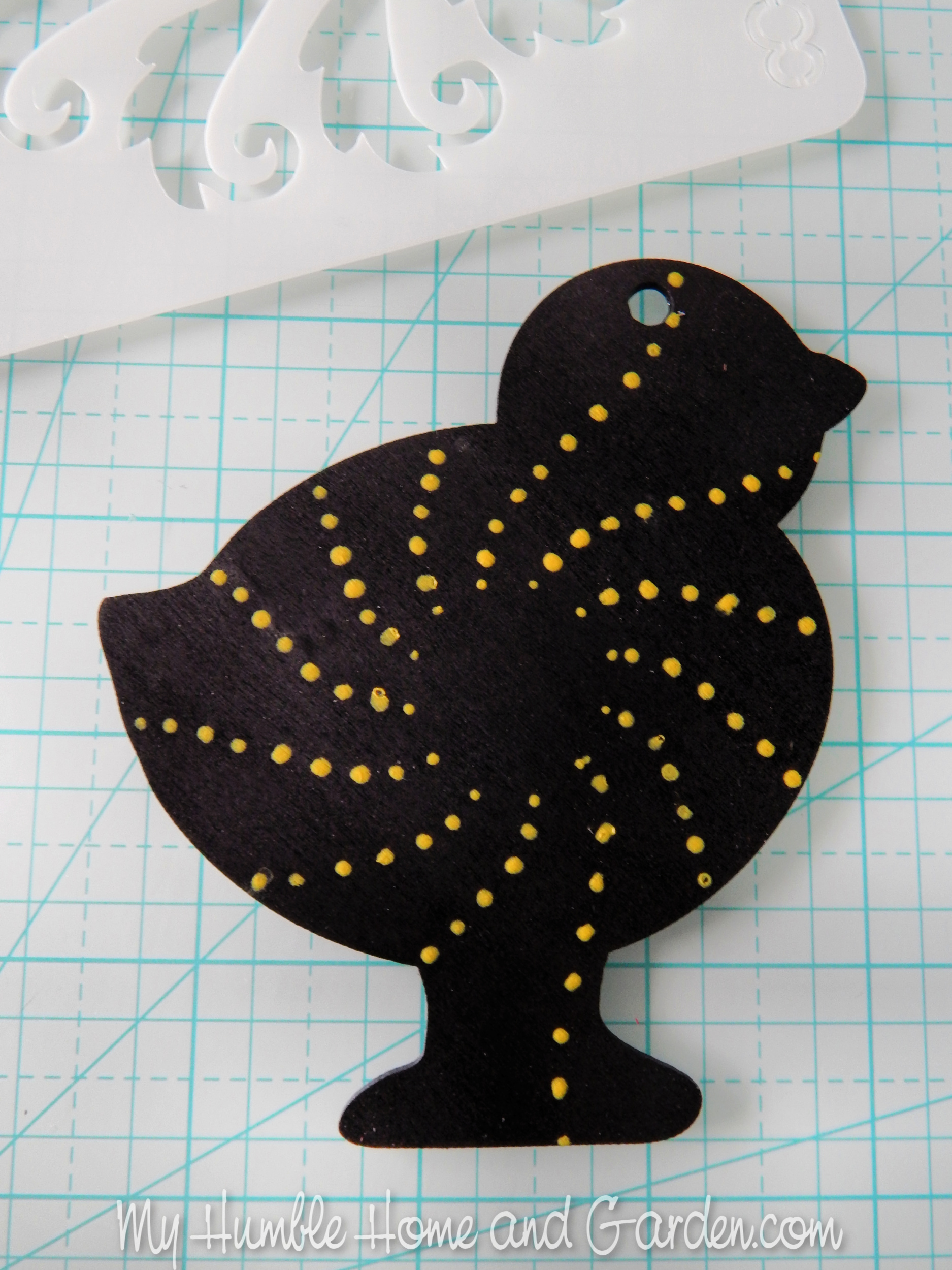Yellow dots following the stencil opening. How to Paint Dot Mandala on Wooden Chicks, Bunnies, and Carrots #dotmandala #bunnies #mandala #crafts
