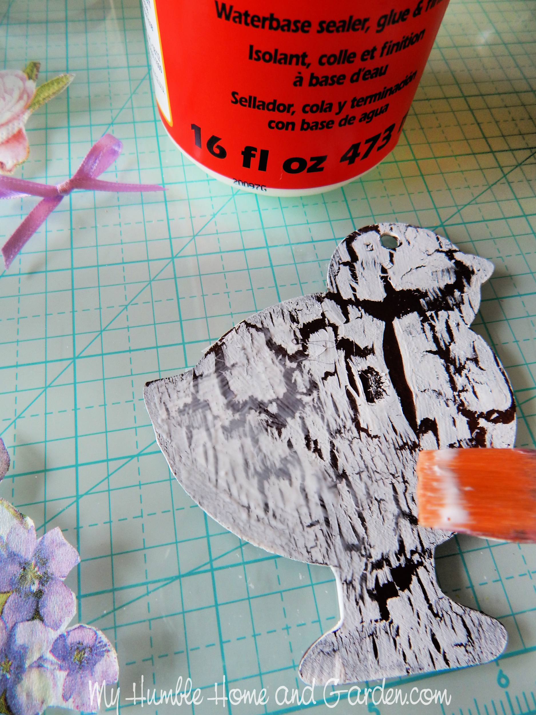 Paint Gloss Mod Podge over the area for the napkin cutout. How to Decoupage and Crackle Paint a Wooden Chick and Bunny. #cracklepaint #decoupage