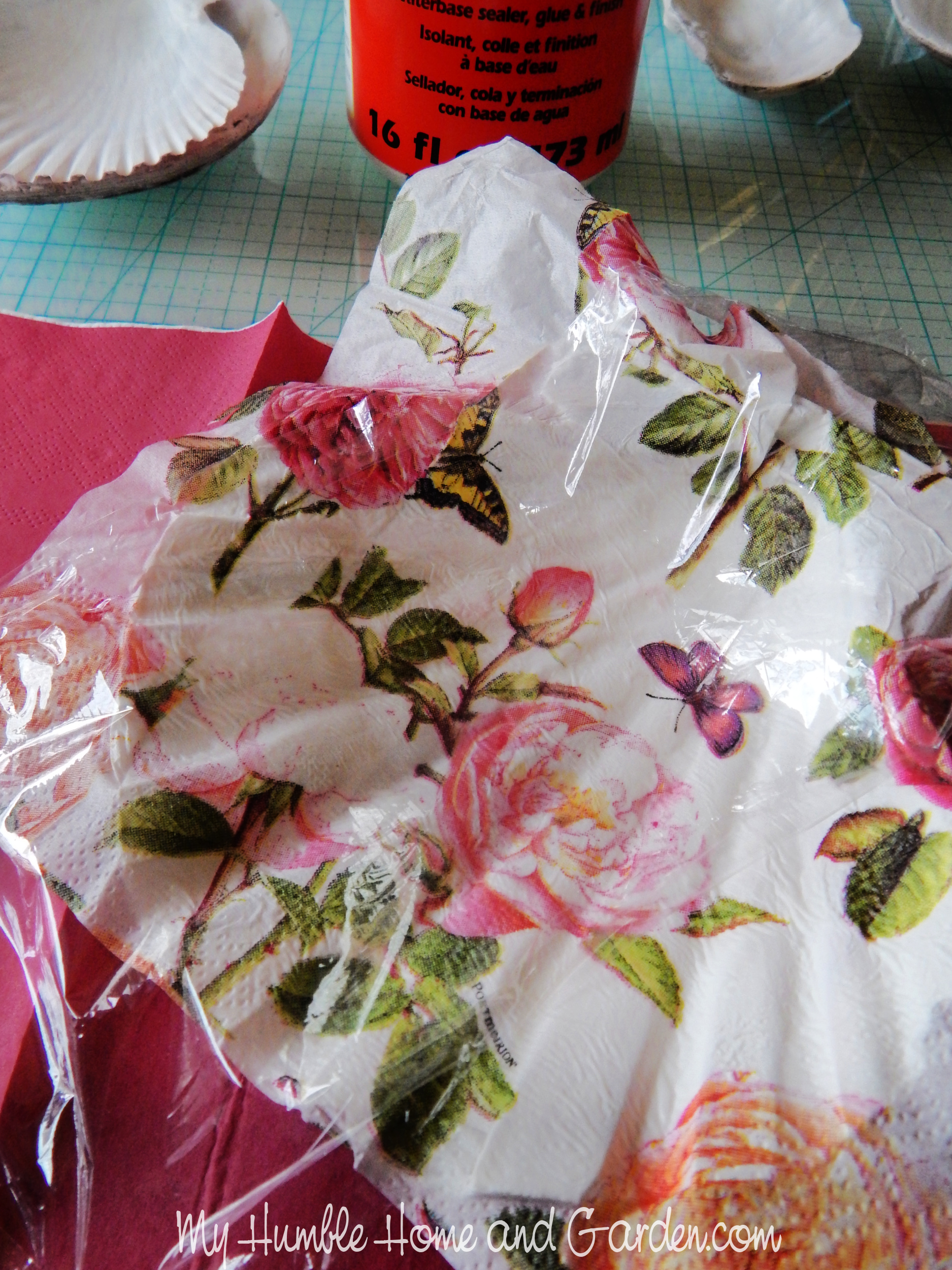 Lay plastic wrap over the napkin and smooth onto the seashell. How to Make Decoupage Oyster and Seashell Trinket Dishes #seashelltrinketdish #seashell #decoupage