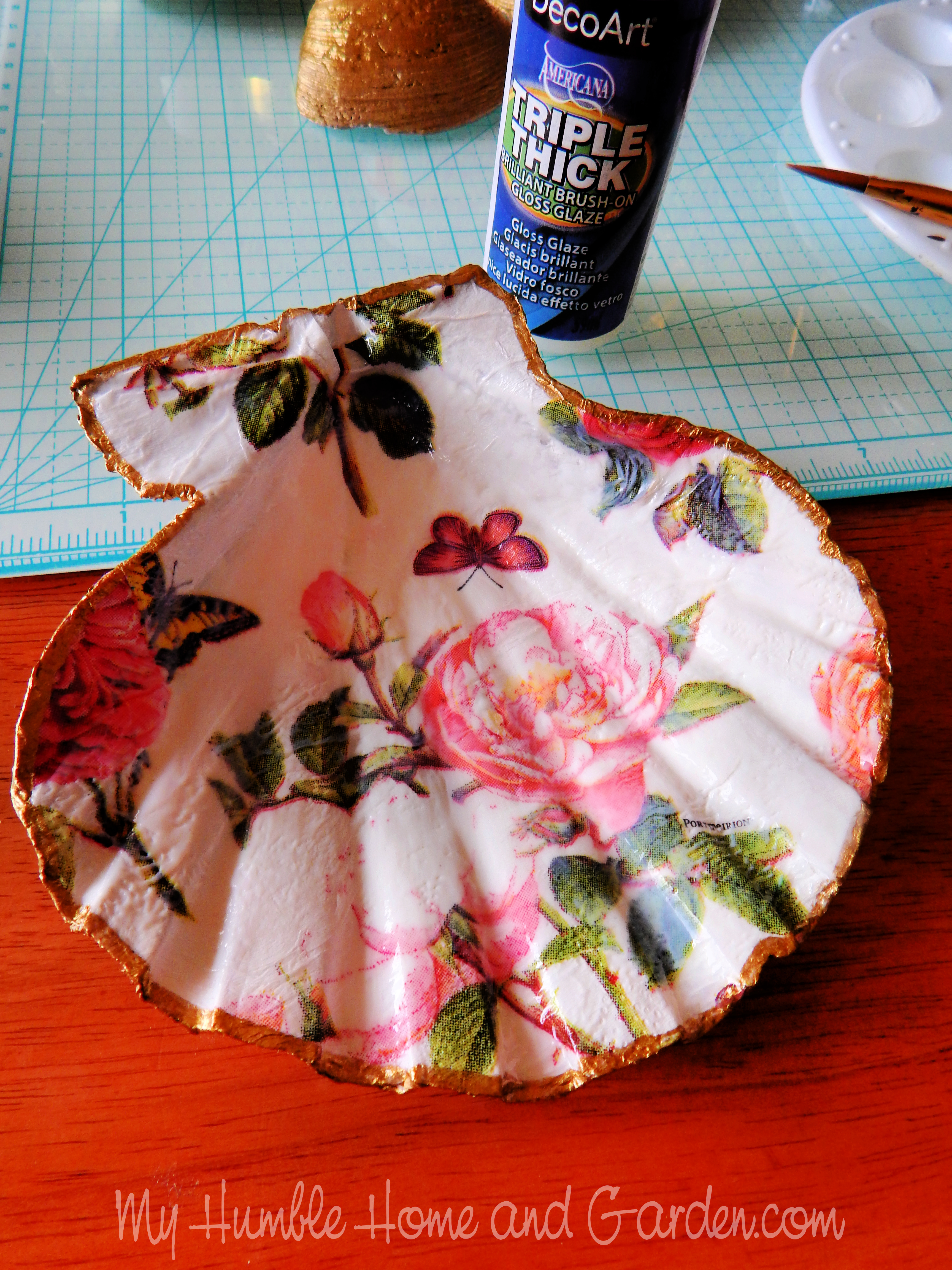 Paint the inside with Americana Triple Thick Gloss Glaze How to Make Decoupage Oyster and Seashell Trinket Dishes #seashelltrinketdish #seashell #decoupage