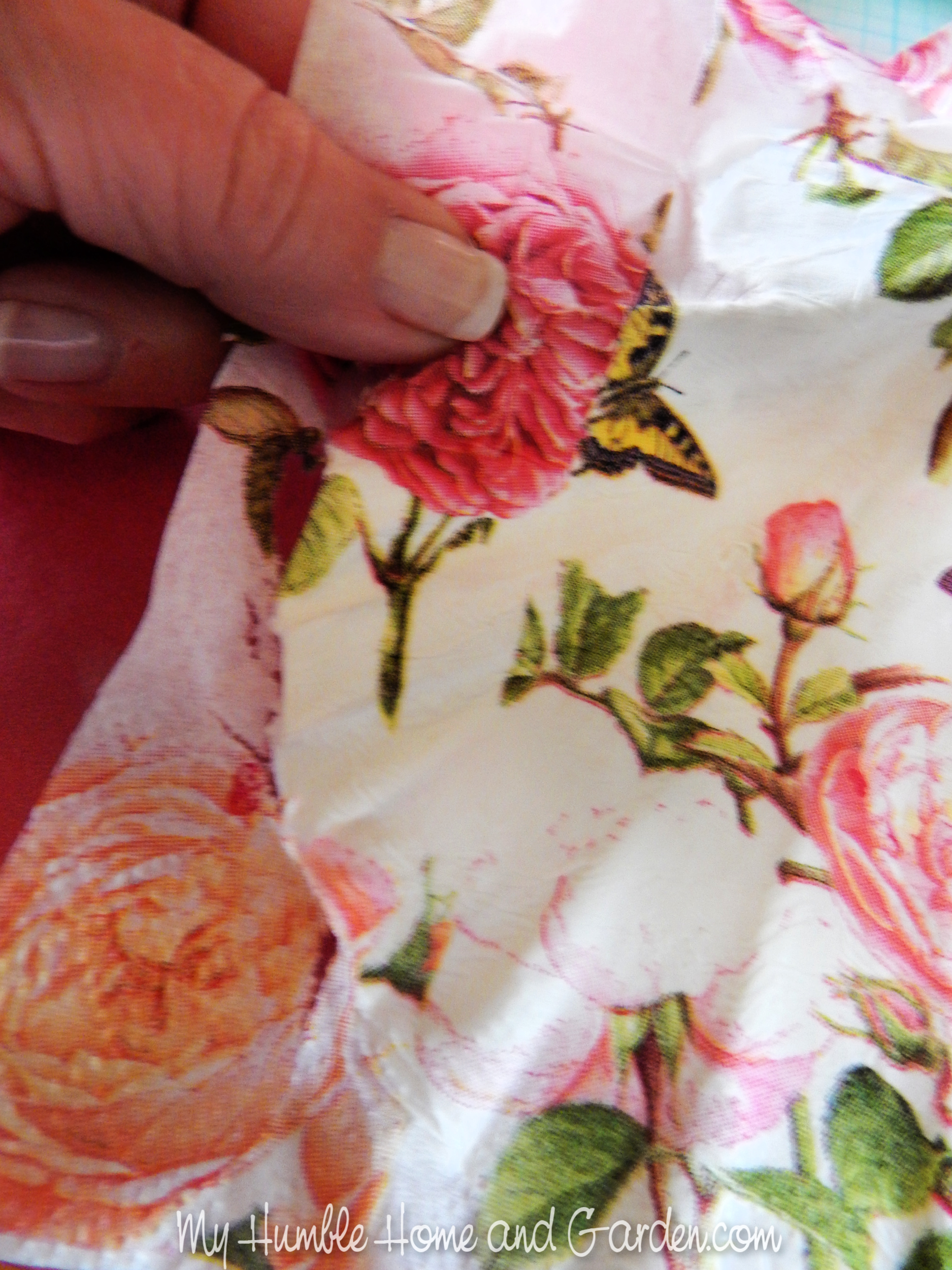 Tear the napkin downward around seashell edges. How to Make Decoupage Oyster and Seashell Trinket Dishes #seashelltrinketdish #seashell #decoupage