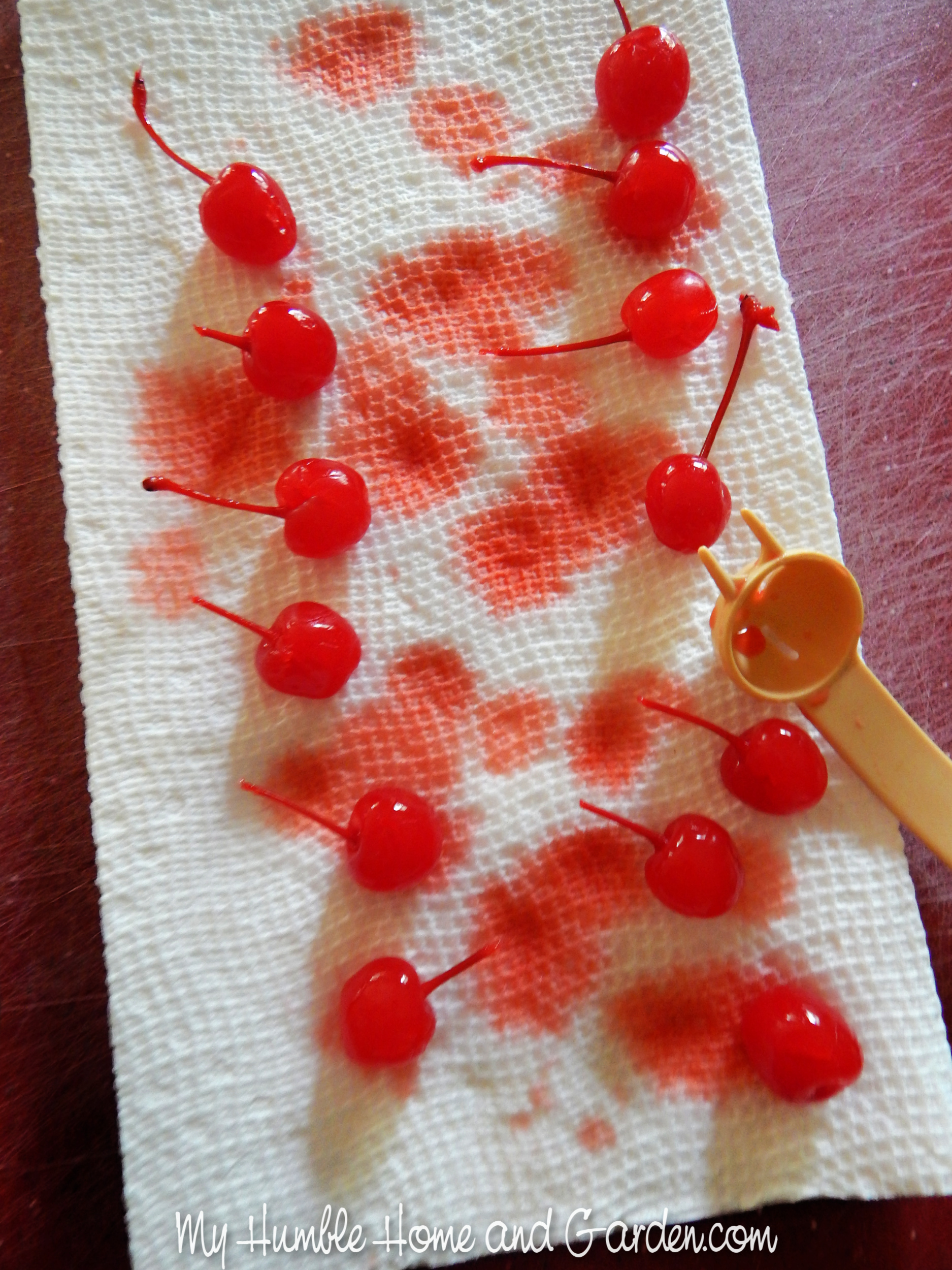 Lay cherries on a paper towel to absorb excess liquid. Simply the Best Pineapple Upside Down Cupcakes #upsidedowncupcakes #pineapple #pineappleupsidedowncakes