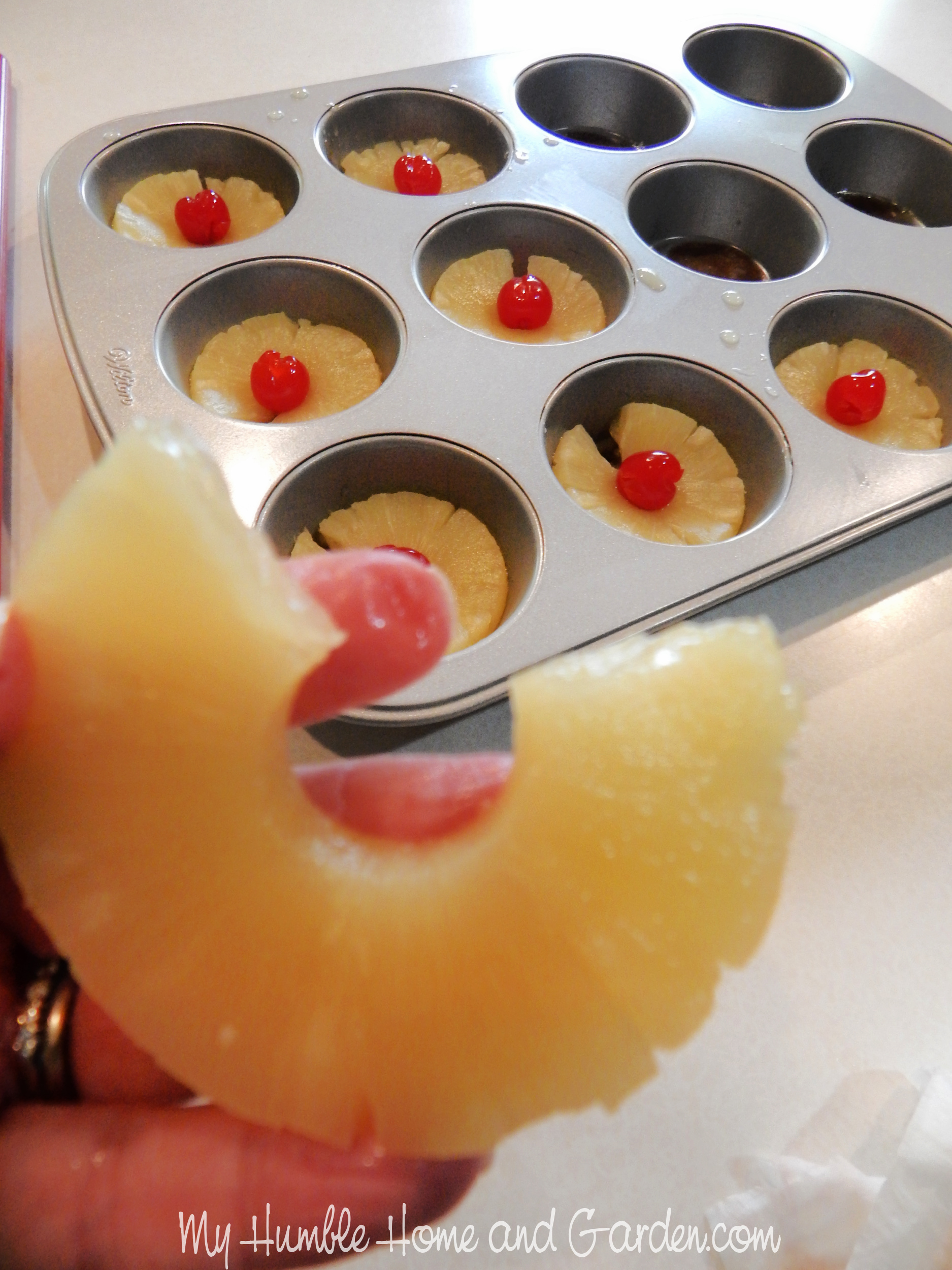 Remove part of the pineapple ring Simply the Best Pineapple Upside Down Cupcakes #upsidedowncupcakes #pineapple #pineappleupsidedowncakes