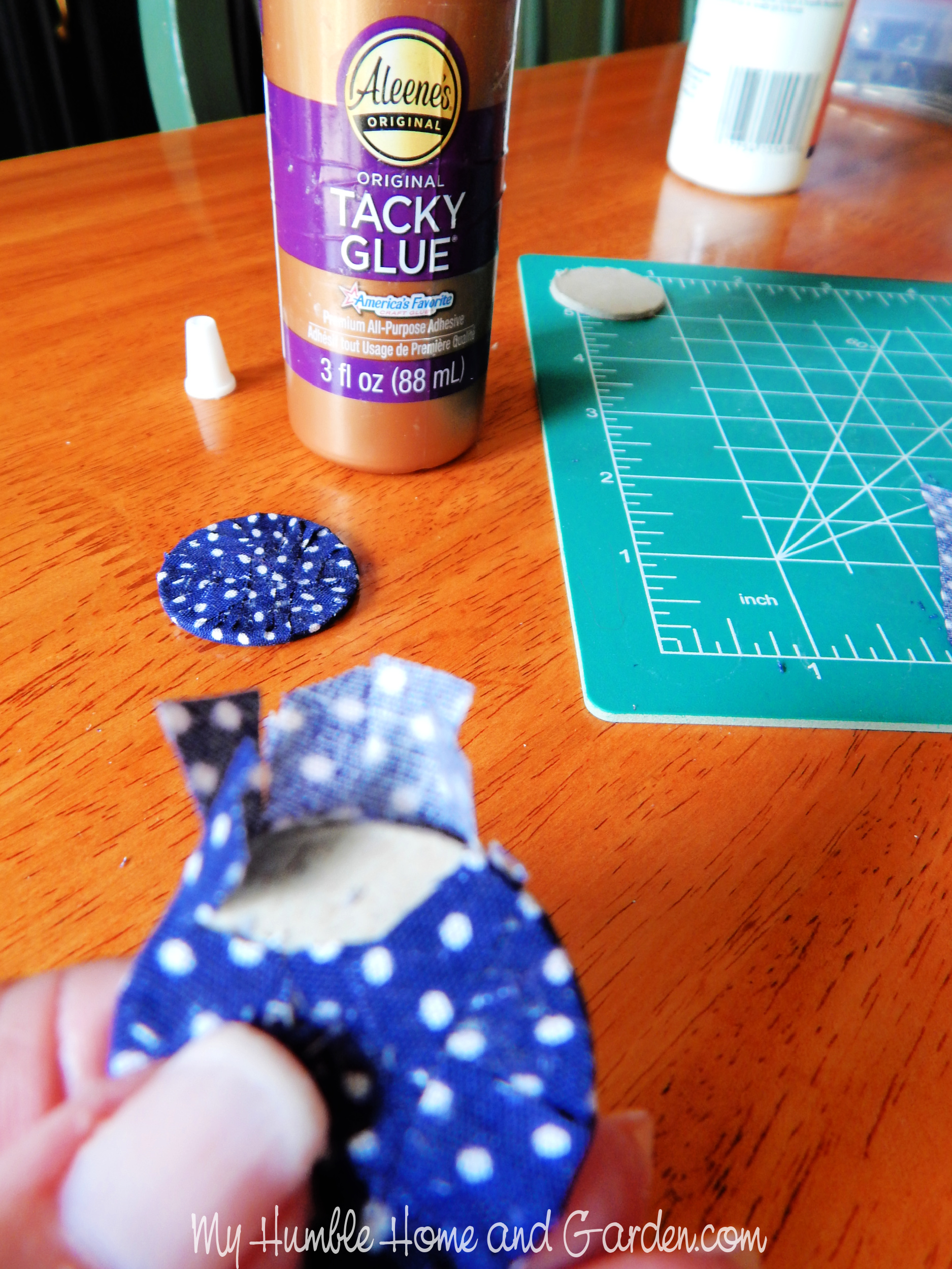 Glue all of the tabs to the back of the round. How to Make Patriotic Fabric Ring Flowers in a Oui Jar. #ouijar #fabricringflowers #fabricflowers