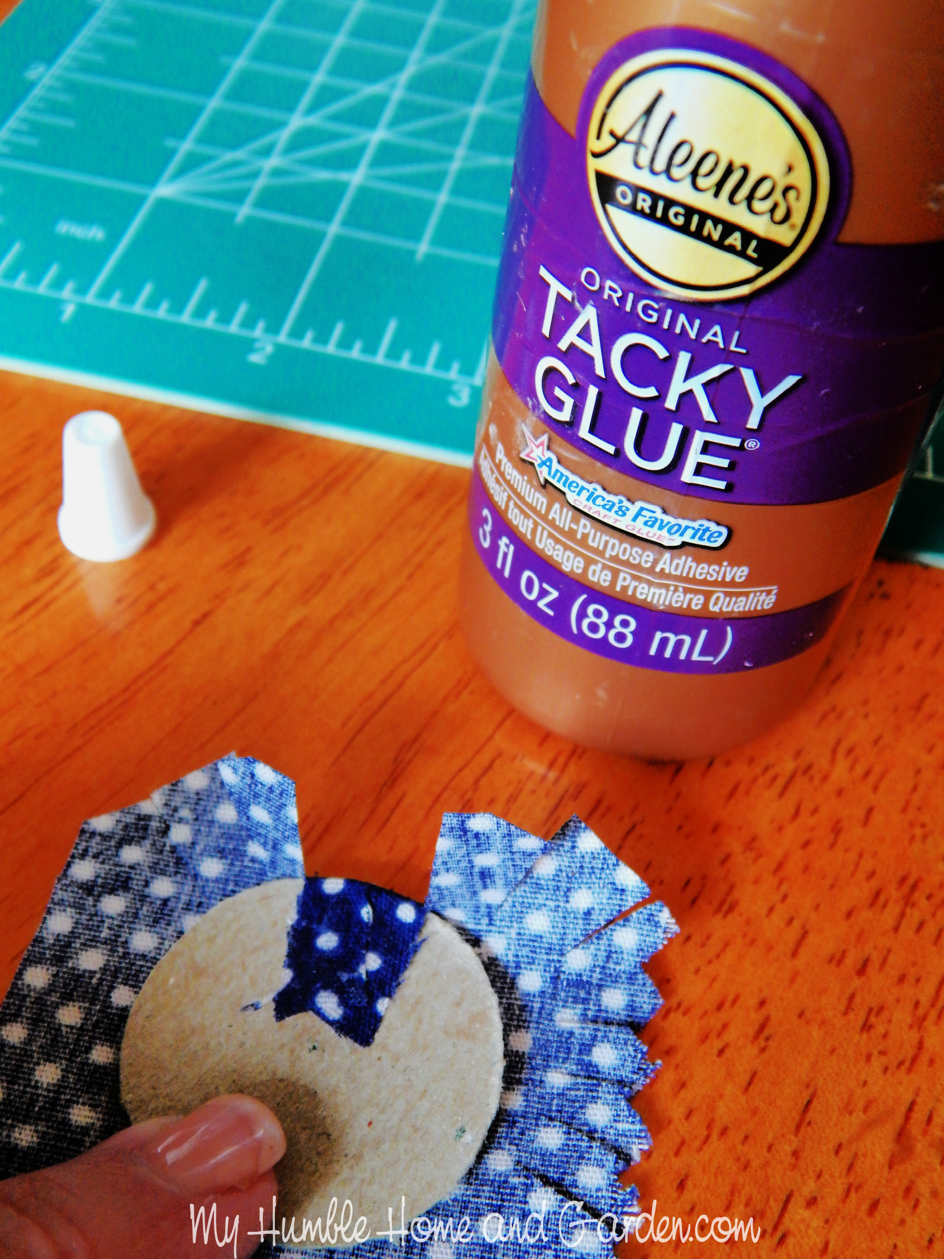 Glue the tabs onto the back of the round. How to Make Patriotic Fabric Ring Flowers in a Oui Jar. #ouijar #fabricringflowers #fabricflowers