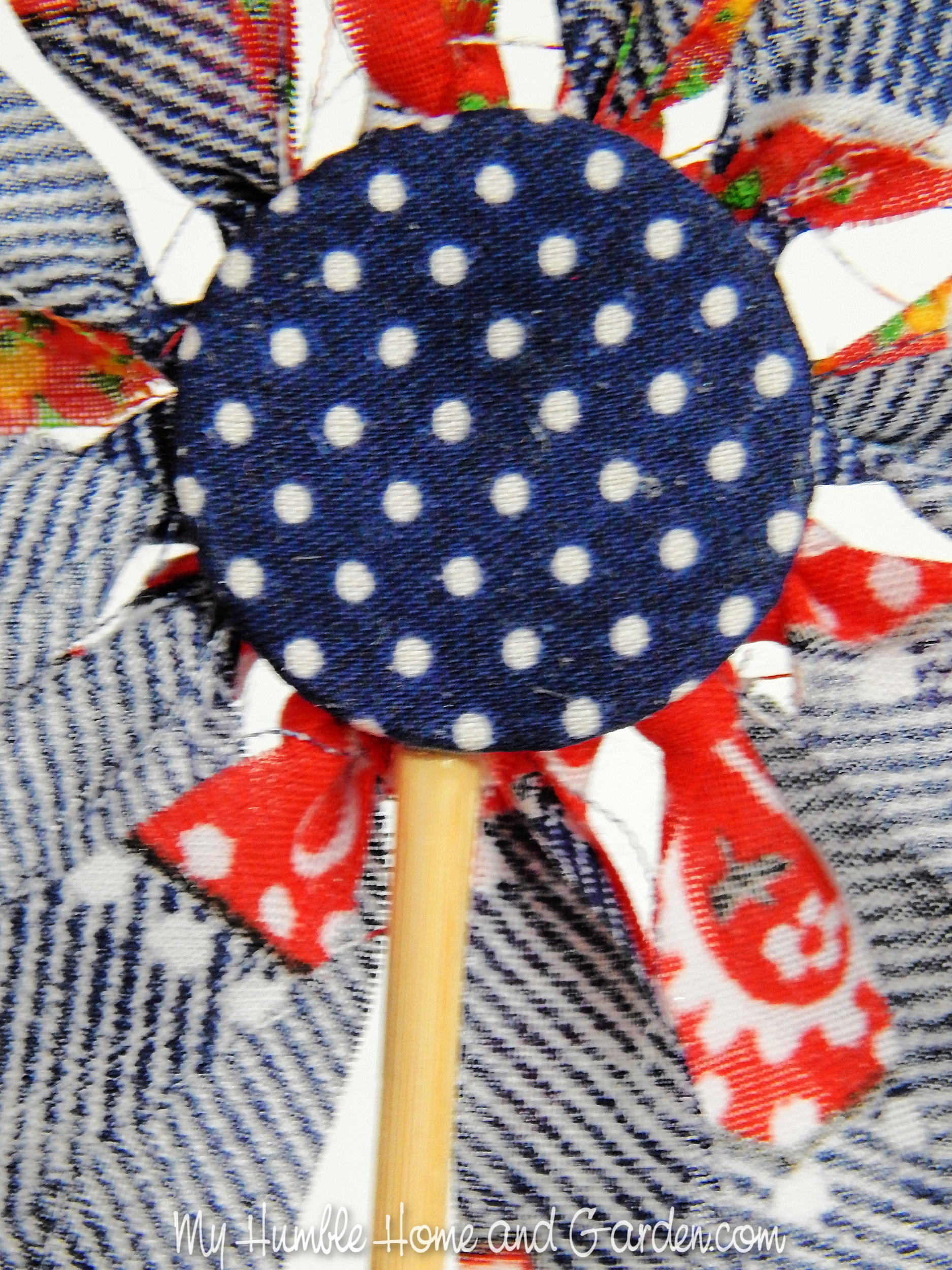 Glue the wooden pick to the center ring on the back side. How to Make Patriotic Fabric Ring Flowers in a Oui Jar. #ouijar #fabricringflowers #fabricflowers