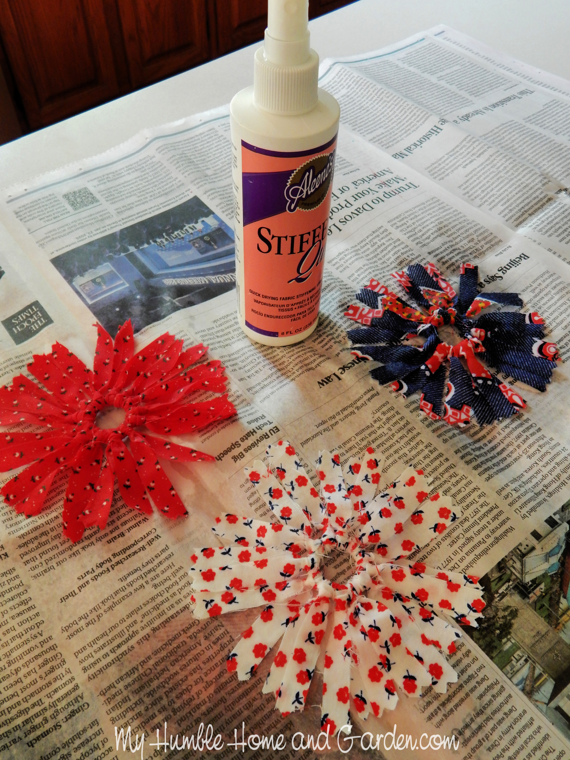 Saturate the fabric flowers with Stiffen Quick spray. How to Make Patriotic Fabric Ring Flowers in a Oui Jar. #ouijar #fabricringflowers #fabricflowers