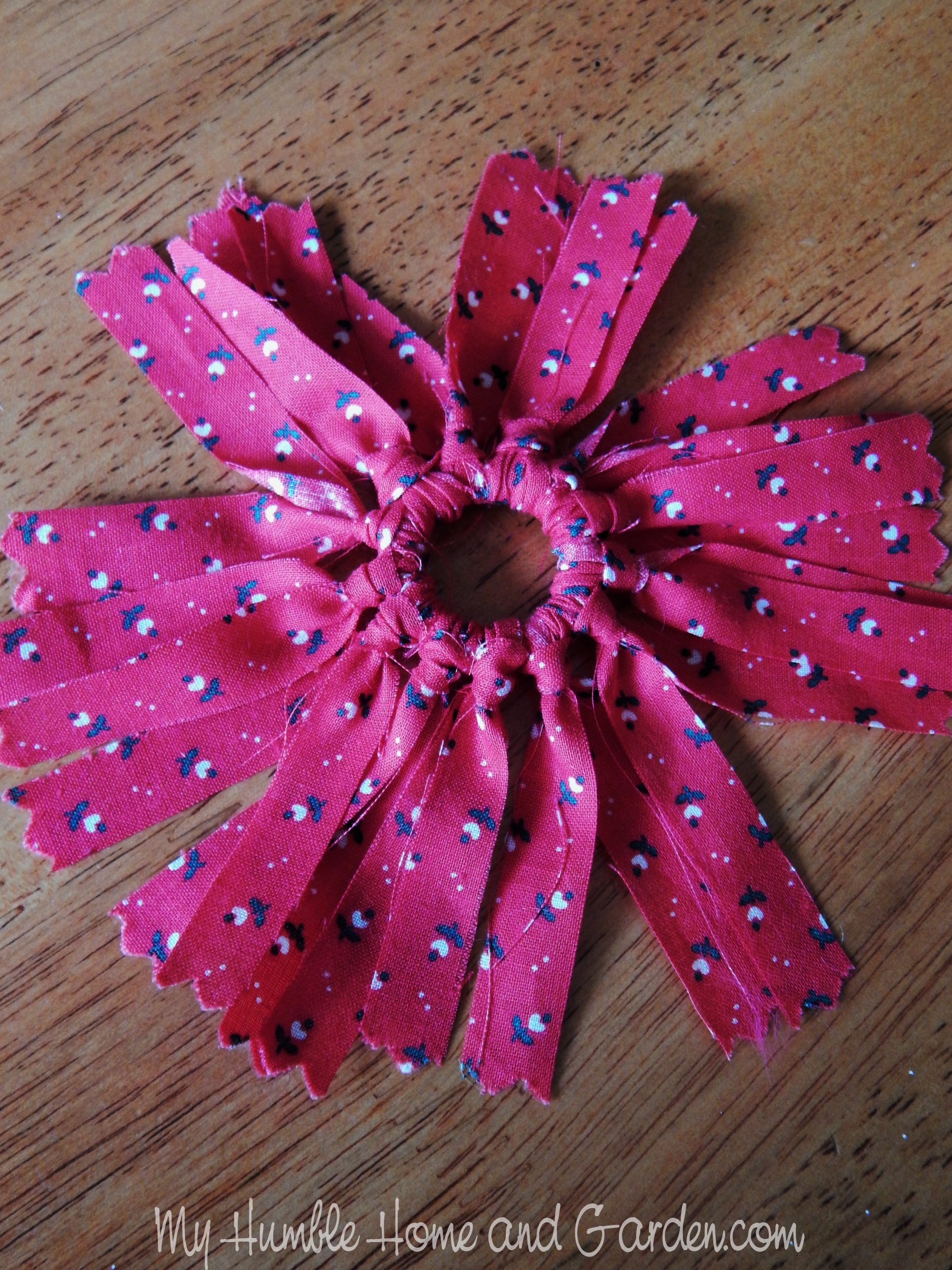 Tie all of the strips to the ring. How to Make Patriotic Fabric Ring Flowers in a Oui Jar. #patrioticfabricringflowers #fabricflowers #ouijars