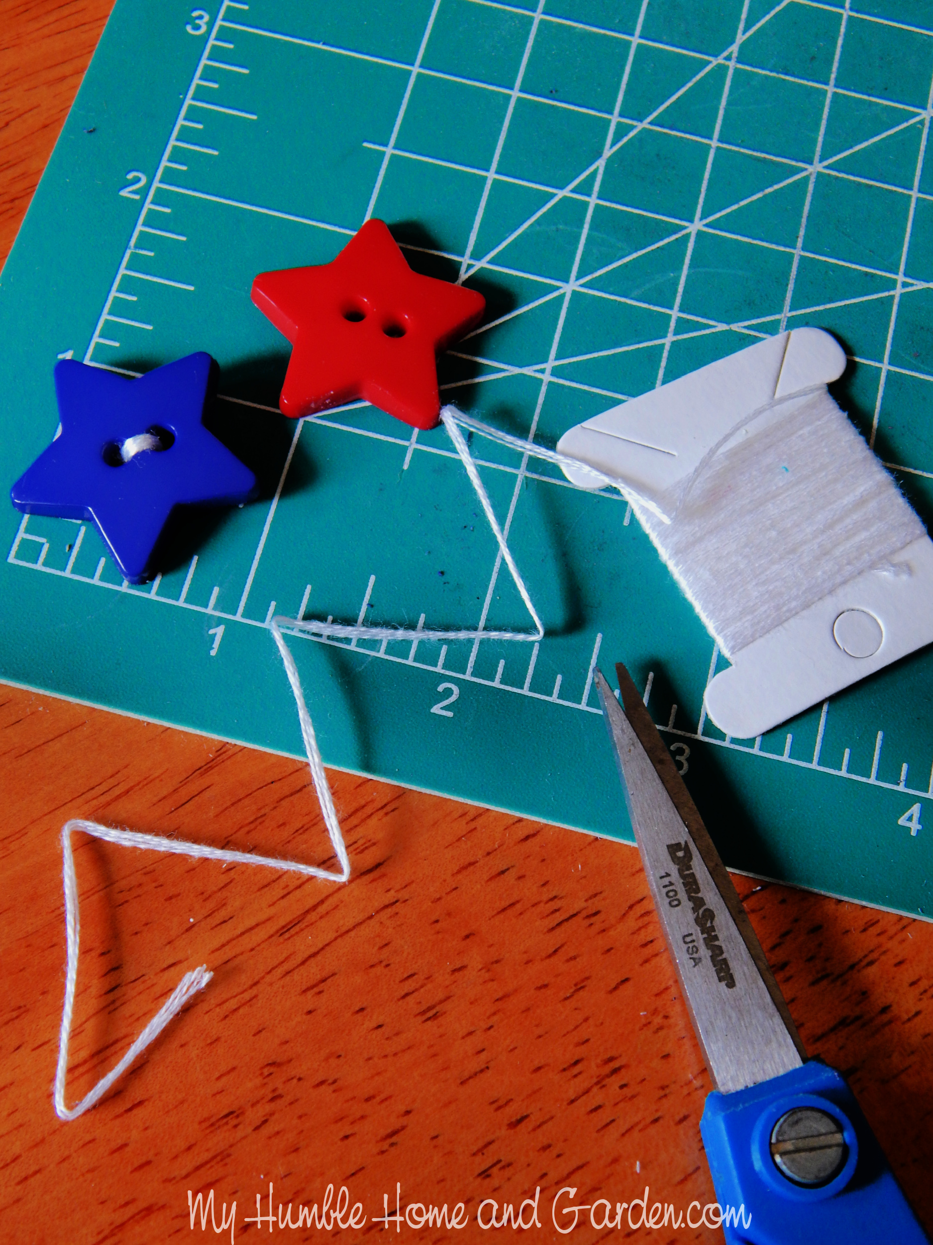 Tie embroidery floss to the button holes. How to Make Patriotic Fabric Ring Flowers in a Oui Jar. #ouijar #fabricringflowers #fabricflowers