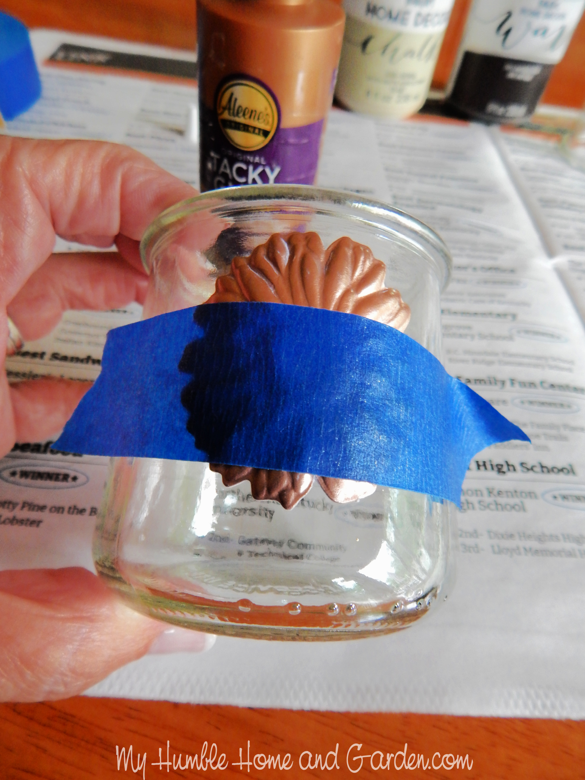 Use painter’s tape to hold the sticker in place. How to Use Stickers and Paint to Decorate Oui Yogurt Jars #ouiyogurtjars #yogurtjars