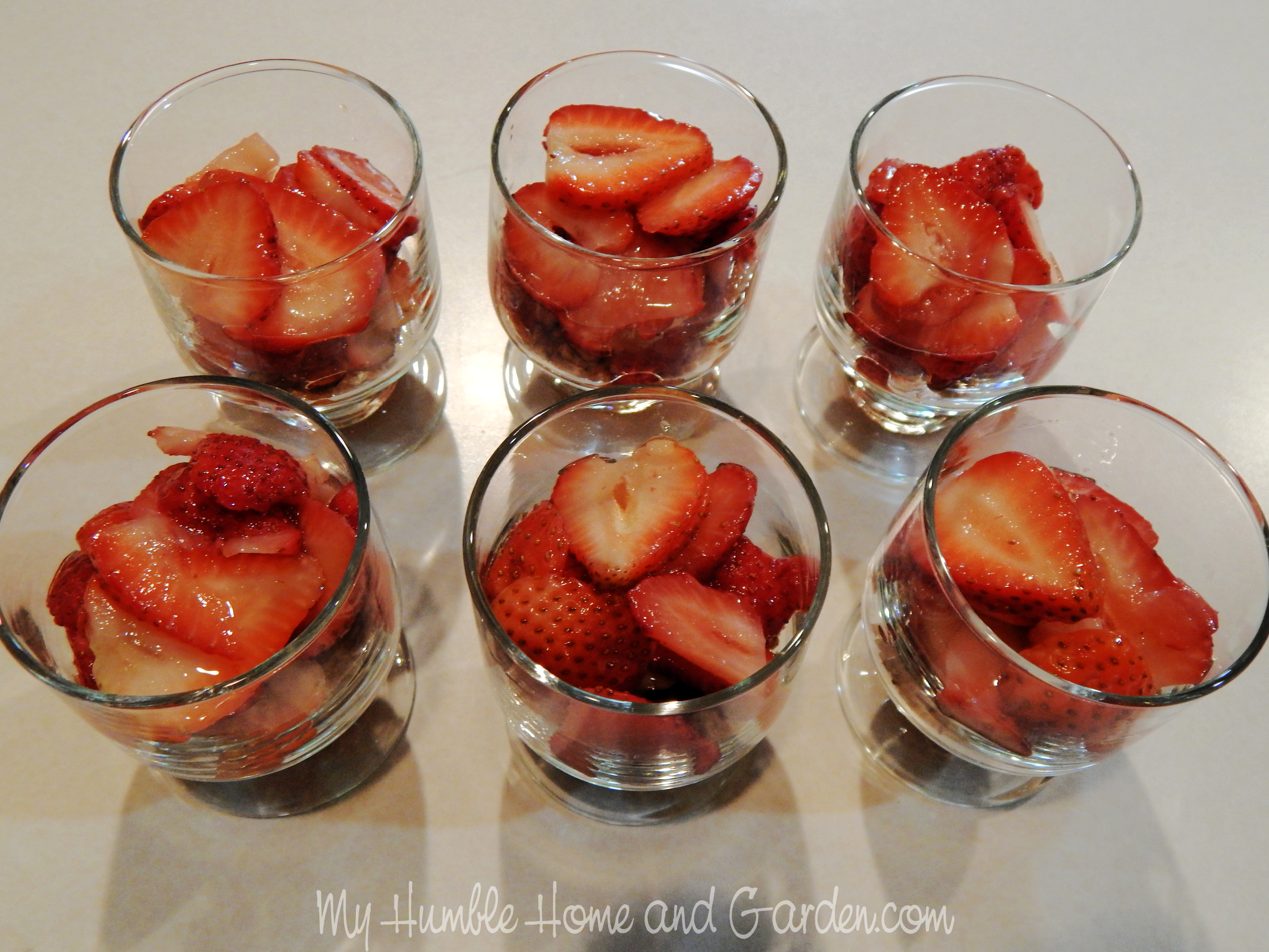 Spoon the strawberry mixture over the crumble. Strawberry Budini Parfaits – A Quick and Easy Mini Dessert #minidessert #strawberrybudini #budini