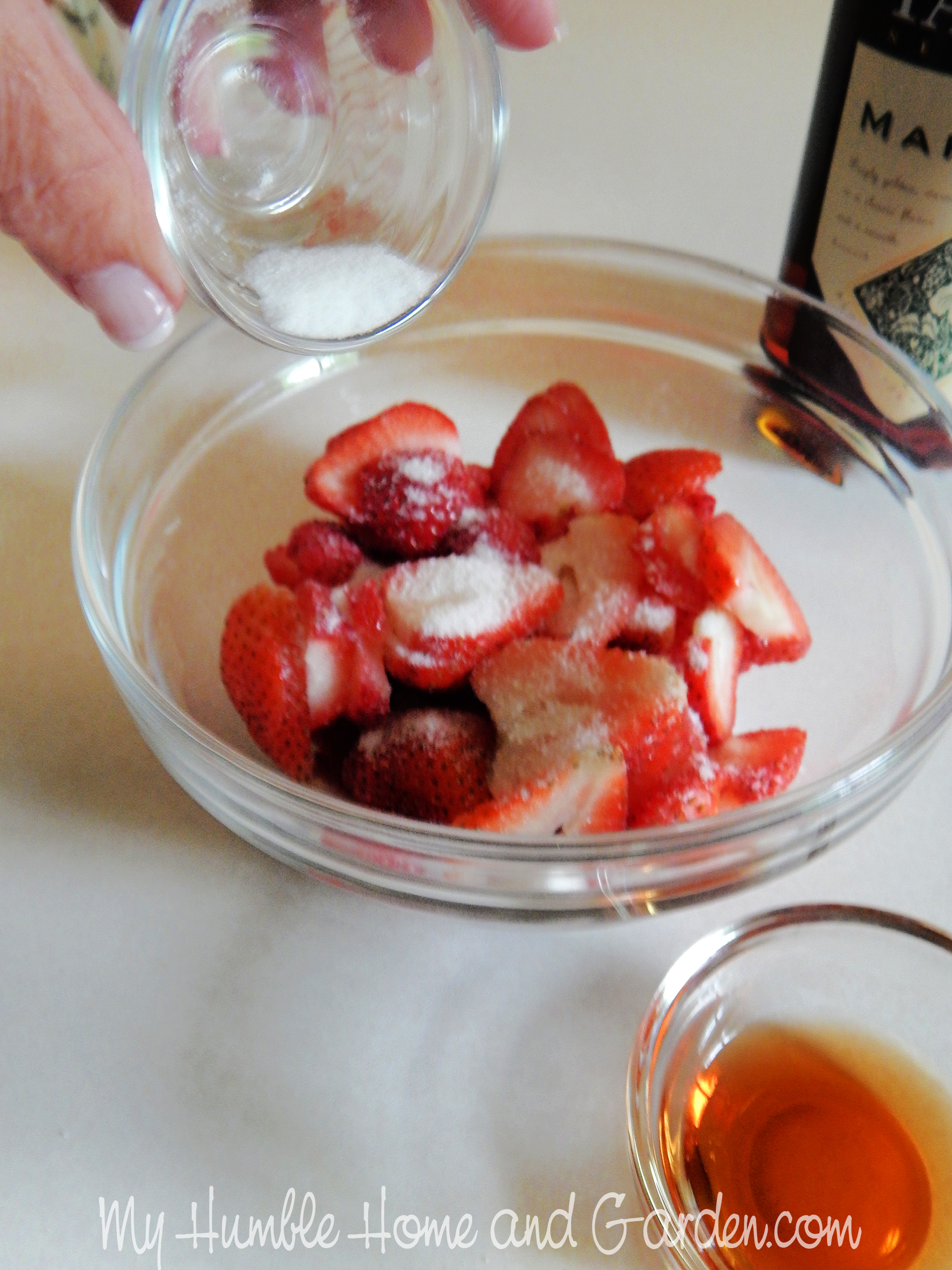 Sprinkle the sugar over the sliced strawberries.