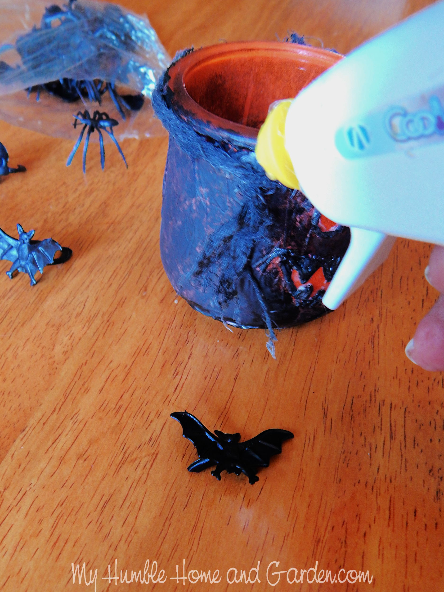 Cut the bat off the ring and adhere to the cheesecloth. How to Make DIY Creepy Oui Jar Lanterns #diycreepyouijarlanterns #ouijarcrafts