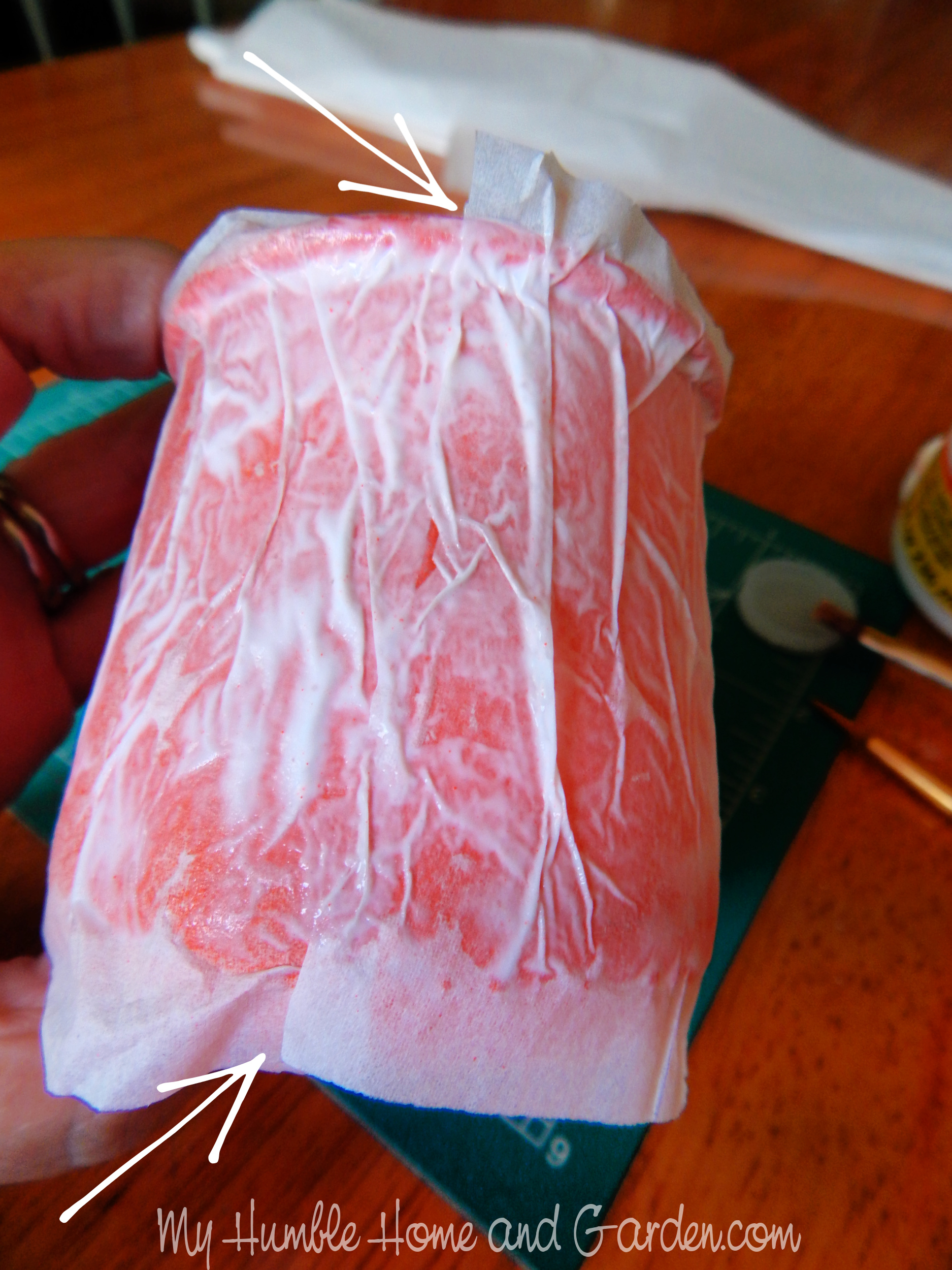 The ends are obscured with the glue and the wrinkles. How to Make DIY Creepy Oui Jar Lanterns #diycreepyouijarlanterns #ouijarcrafts