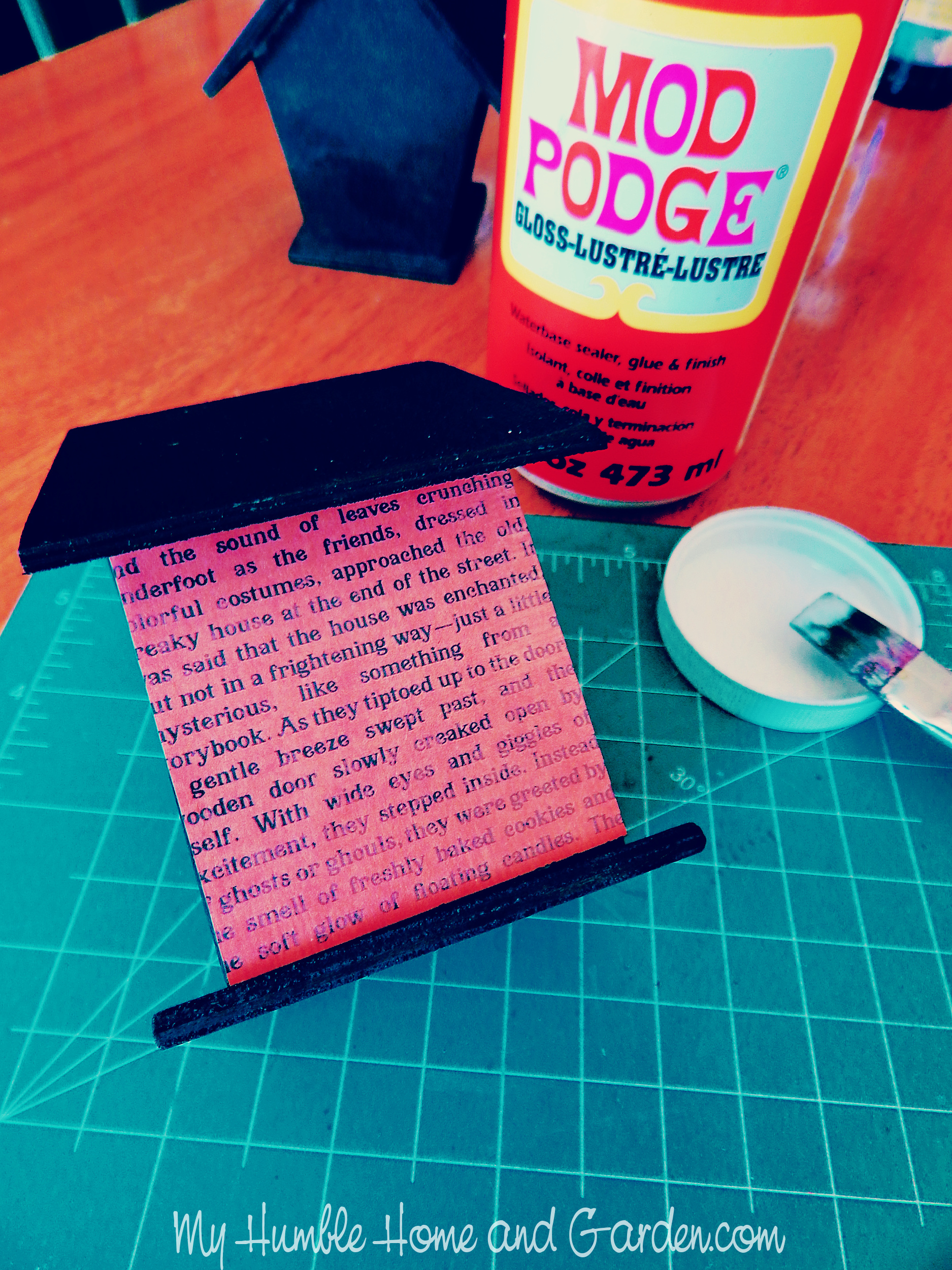 Adhere the cutouts to the house with Mod Podge. Dollar Tree Haunted House Craft Ideas You’ll Love #dollartreecraft #hautedhouse #halloweencrafts #spookyhousediy