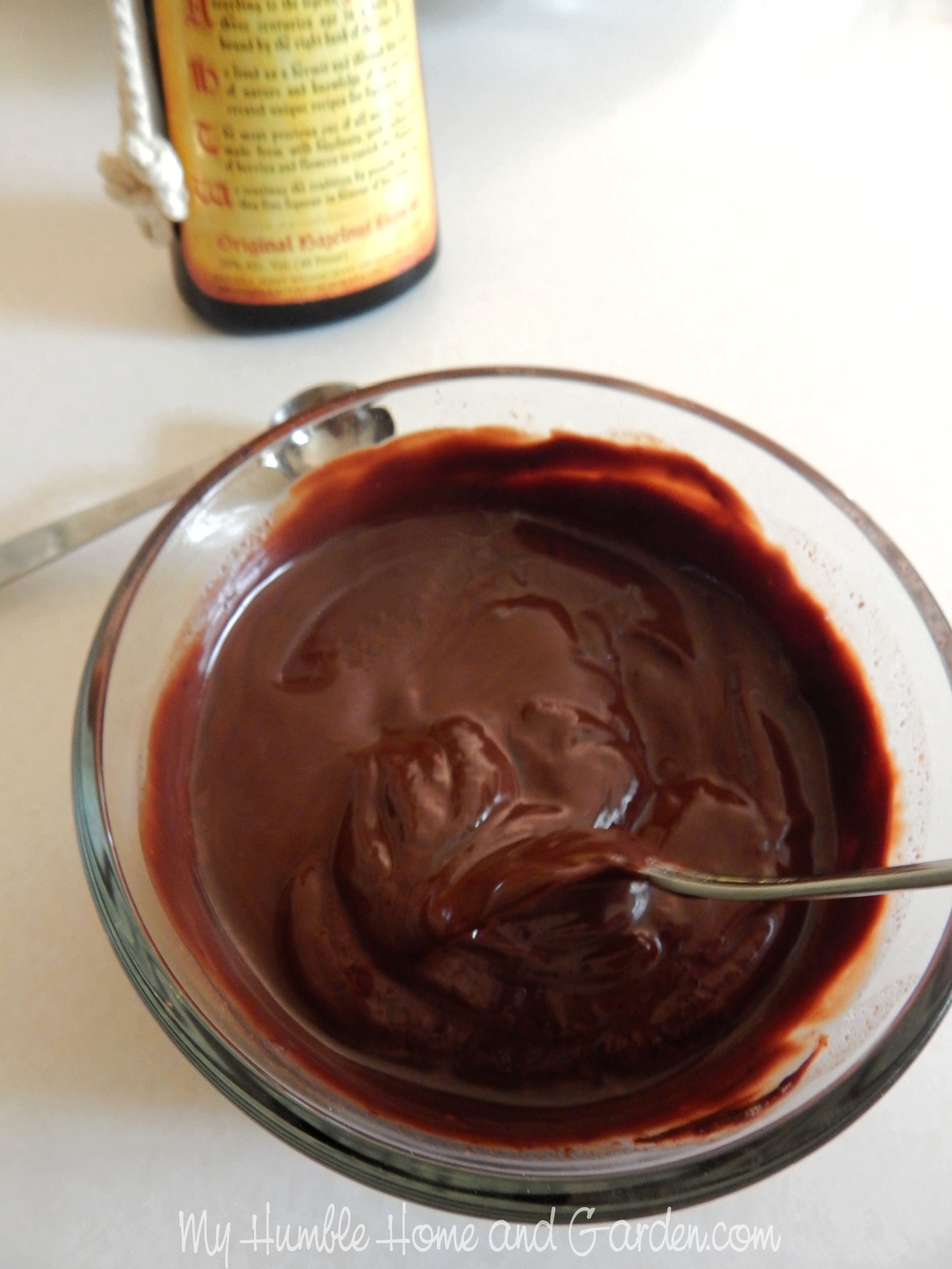 Then, stir the chocolate and cream together until thoroughly mixed and smooth. Stir in the Frangelico.