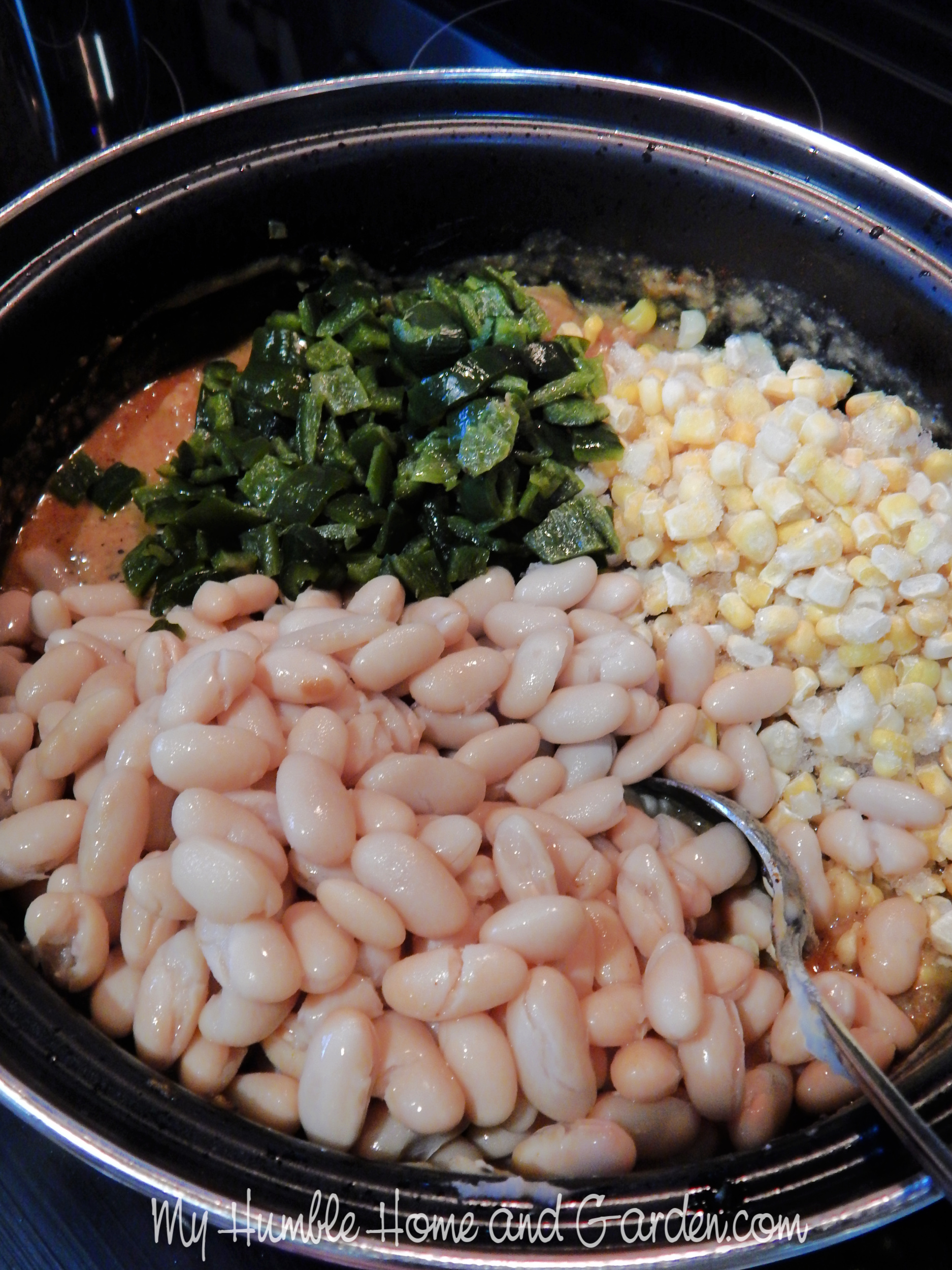 Add the remaining 2 cans of beans, the poblano, and the corn. Smoky White Chicken Chili Recipe You’ll Love #whitechickenchili