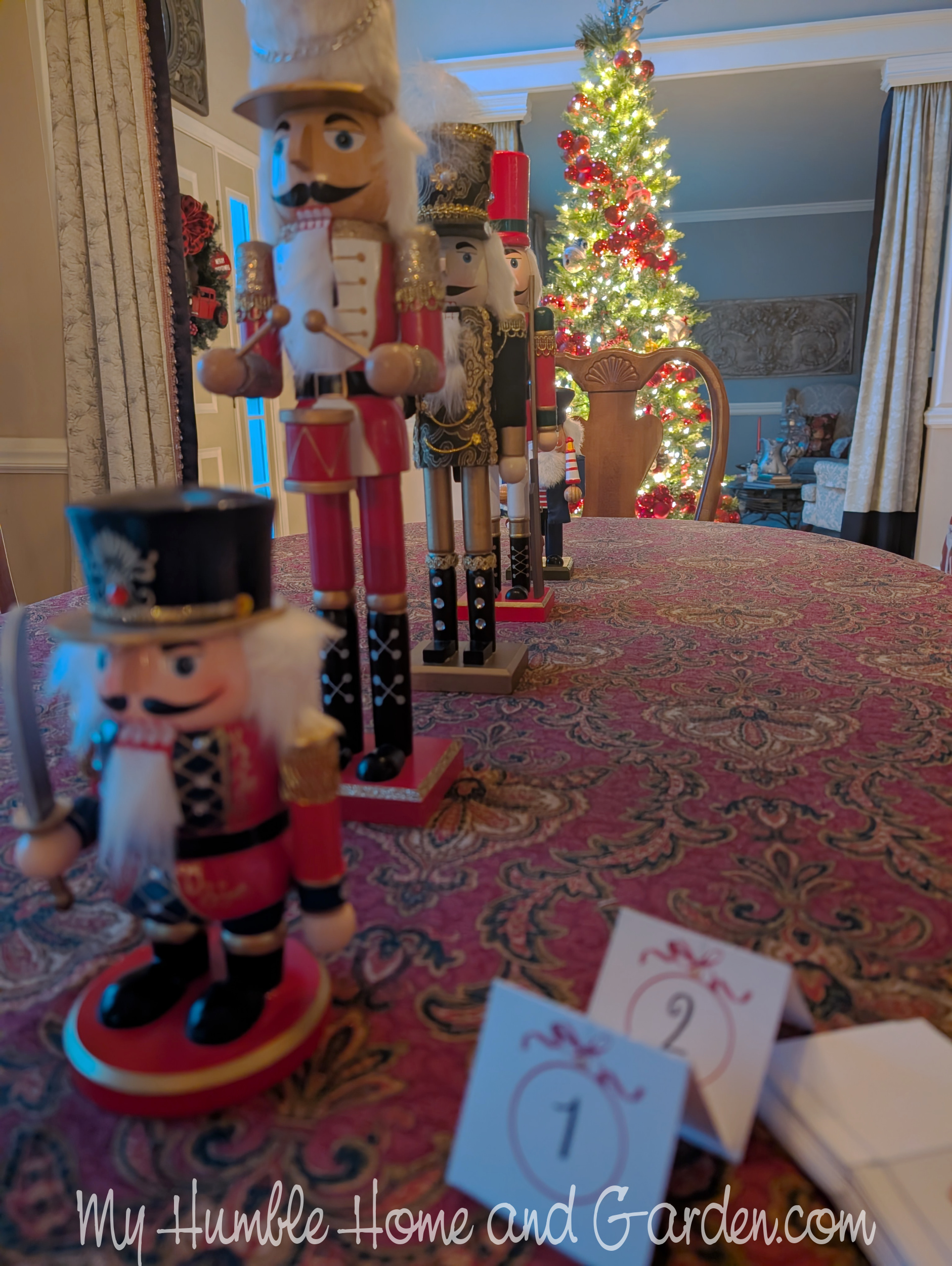A Row of Nutcrackers in the center of the dining room table. How to Add Nutcrackers to Your Christmas Decor #nutcrackerdecor #nutcracker