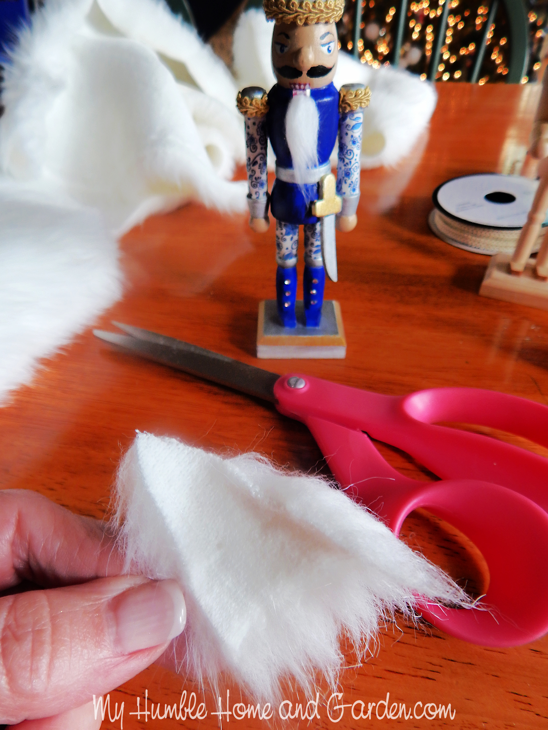 Get creative here. Use Tacky Glue to attach faux fur for the hair and beard. Use sewing trims, jewelry chains, beads, and other embellishments to decorate your nutcracker.