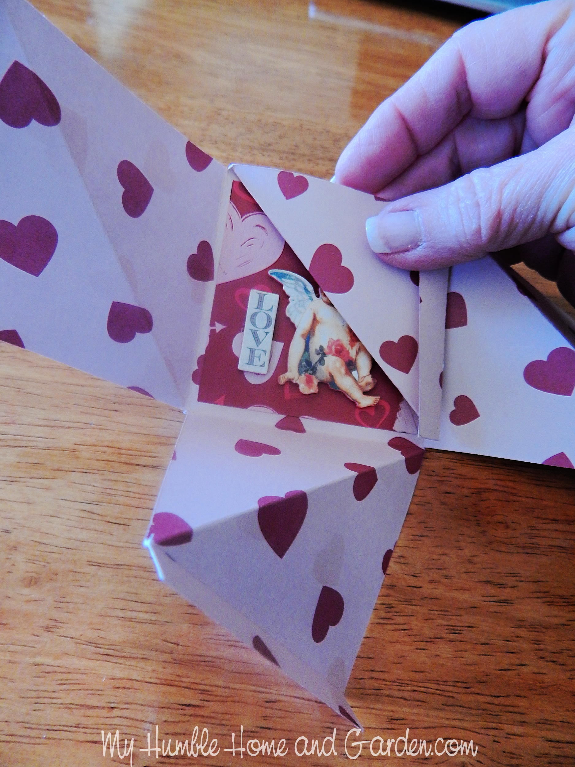 Fold down the first arm with the end flap upward. Posted on 2026-02-022026-02-02Full size 1875 × 2500 Fold down the first arm with the end flap upward. Fold down the first arm with the end flap upward. – DIY Twisty Photo Box for a Valentine Surprise