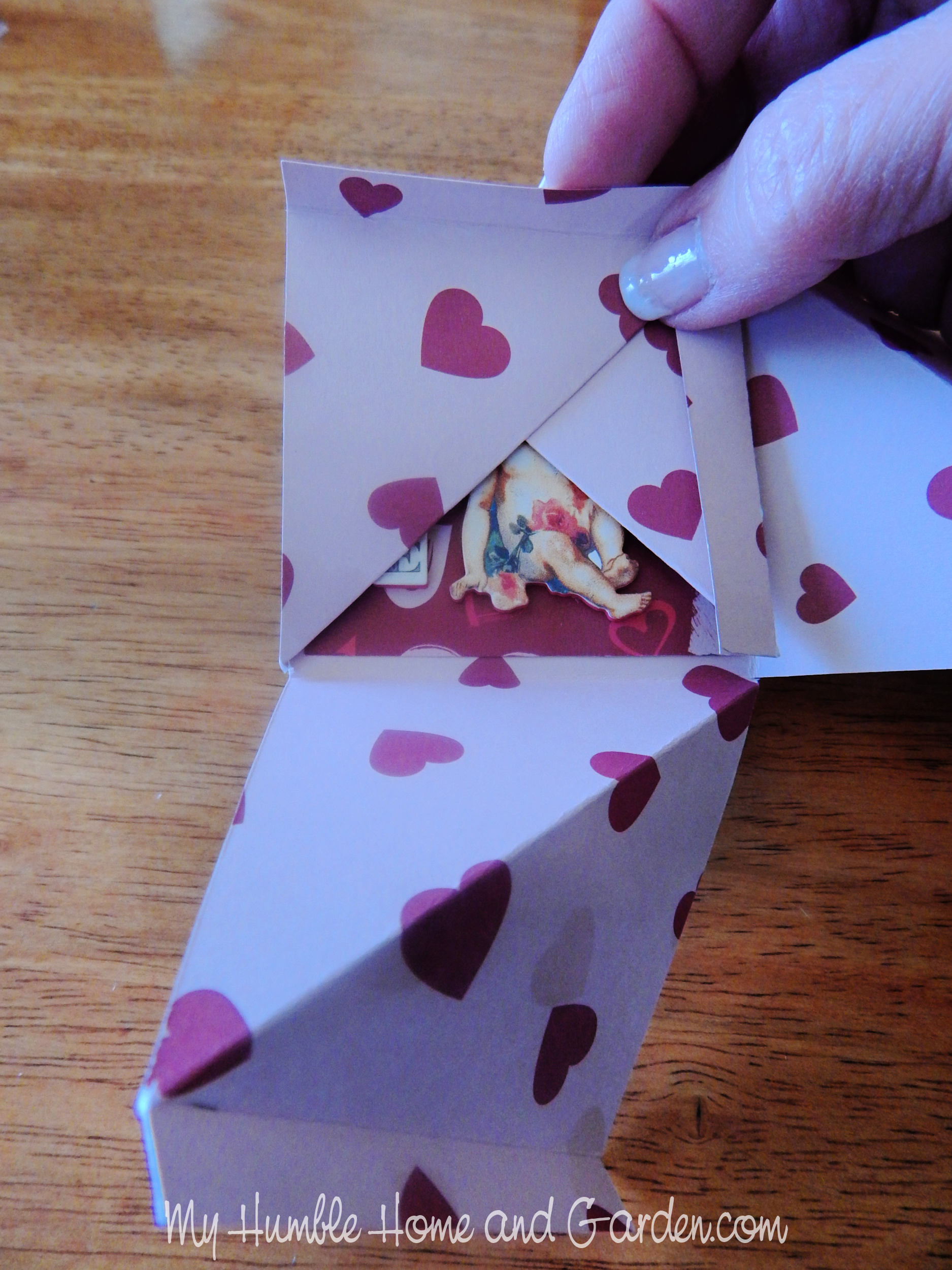 Fold the left arm inward with the flap upward. Posted on 2026-02-022026-02-02Full size 1875 × 2500 Fold the left arm inward with the flap upward. Fold the left arm inward with the flap upward. – DIY Twisty Photo Box for a Valentine Surprise