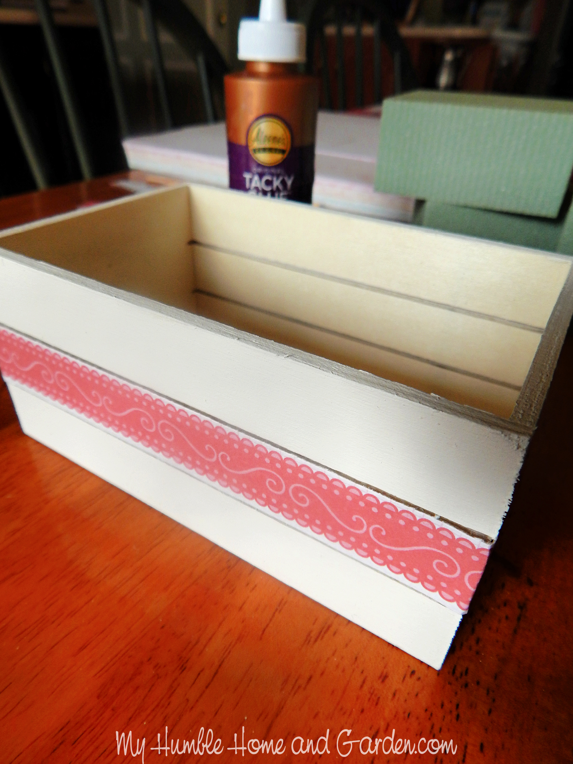 Next, paint the outside of the crate with acrylic craft paint. I used white chalk paint. Then cut a decorative paper strip that coordinates with your chickens. Glue it onto the middle slat on the crate, wrapping the ends, and the opposite side of the crate.