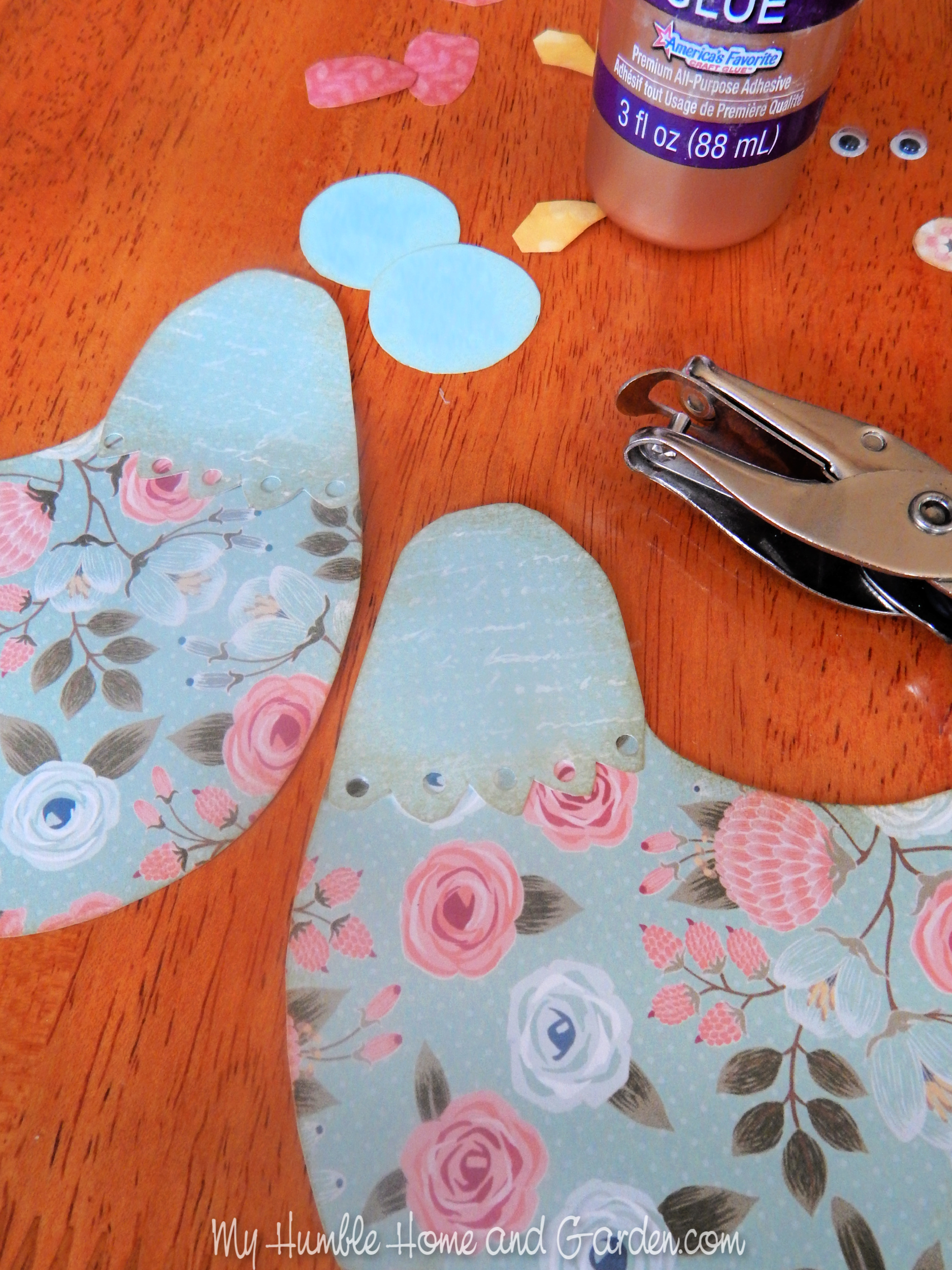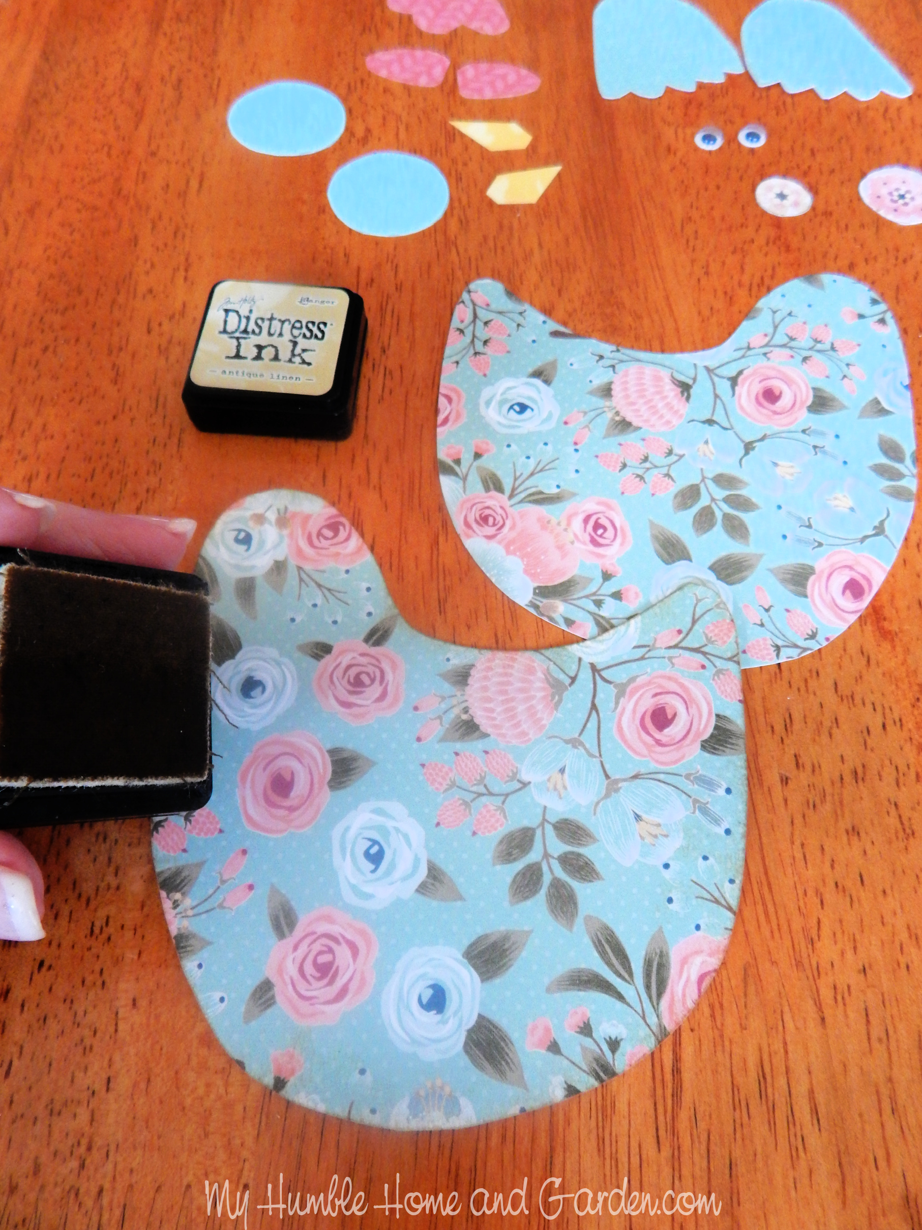 Tim Holtz Antique Linen Distress Ink was used to distress the edges of the paper cutouts. To make this craft, you can draw your own hens or download the PDF in the supplies list below.
